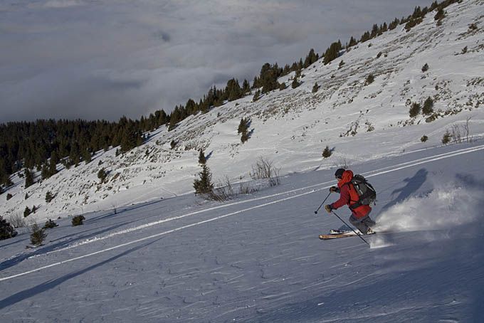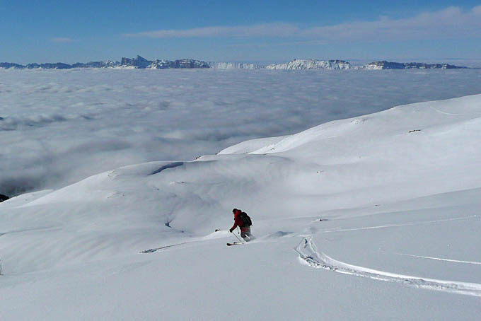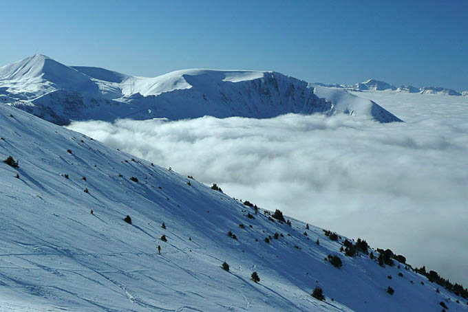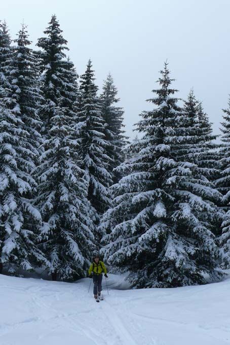 Après un coup d'œil aux webcams, on file voir le soleil au-dessus de 1800 m. Ca c'était prévu. Ce qui ne l'était pas, c'est d'avoir eu une telle qualité de ski à la descente. La première fois, sur le lac de Brouffier, où la poudreuse est ultra légère. La seconde, par la rive gauche des Sallières peu soufflée. Enfin, en suivant les trouées, la forêt passe très bien sans toucher, tout juste 2-3 branches par-ci par-là. Une autre couche par-dessus est demandée au plus vite pour que ce soit encore meilleur !