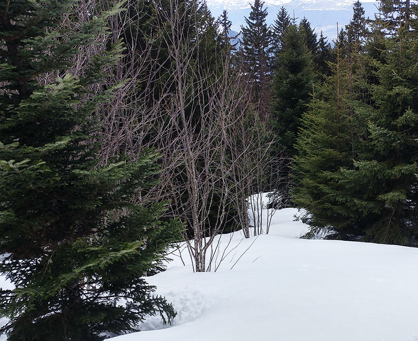 on aimerait parler esquimau pour décrire toutes les variétés de neige portante rencontrées. Il a bien neigé ici, pas moins que sur Belledonne sud. La forêt en a bien bénéficié et s'est régénérée par rapport à février.