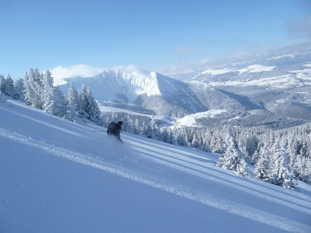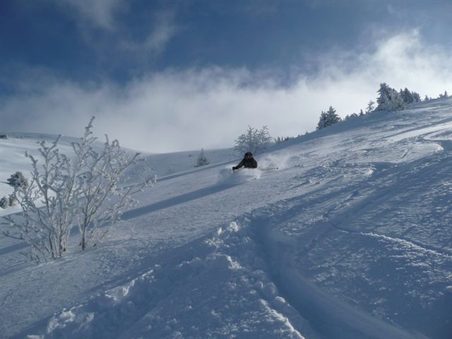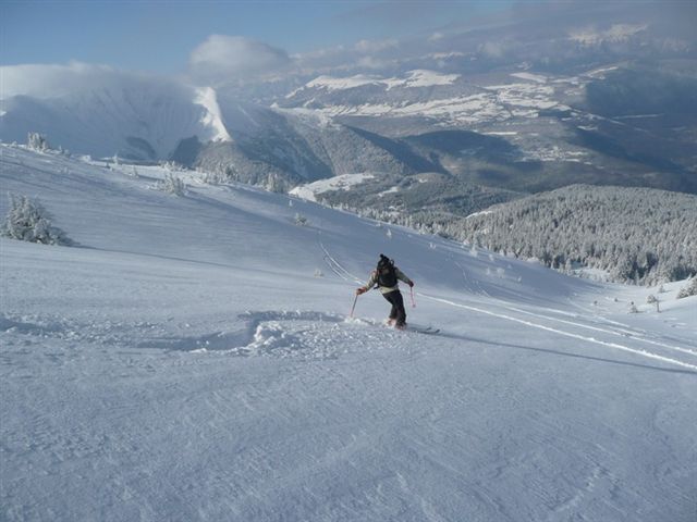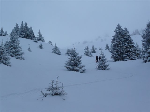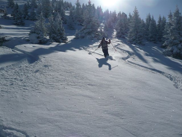 Premiers sur les lieux, nous avons le plaisir de tracer la première partie de l'itinéraire, puis un "d'jeun" solitaire fini le travail (merci à lui). Vent glacial sur la crête au sommet, mais ce vent lève les nuages et la descente comme par magie se révèle à nous comme dans un enchantement. Neige merveilleuse à skier.
