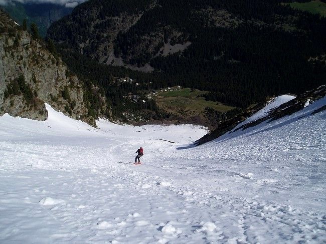 Neige récente à partir de 2000, une dizaine de cm à 2400. Un peu d'enfoncement en haut puis de plus en plus névé à mesure qu'on descend, le tout très agréable à skier. Quelques pentes raides avaient déjà coulées hier.