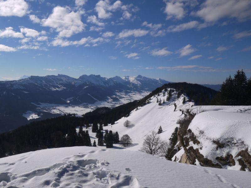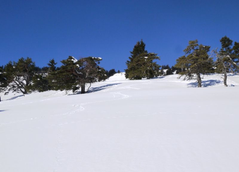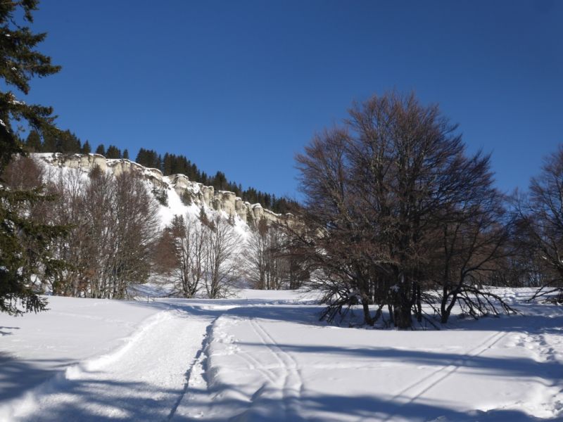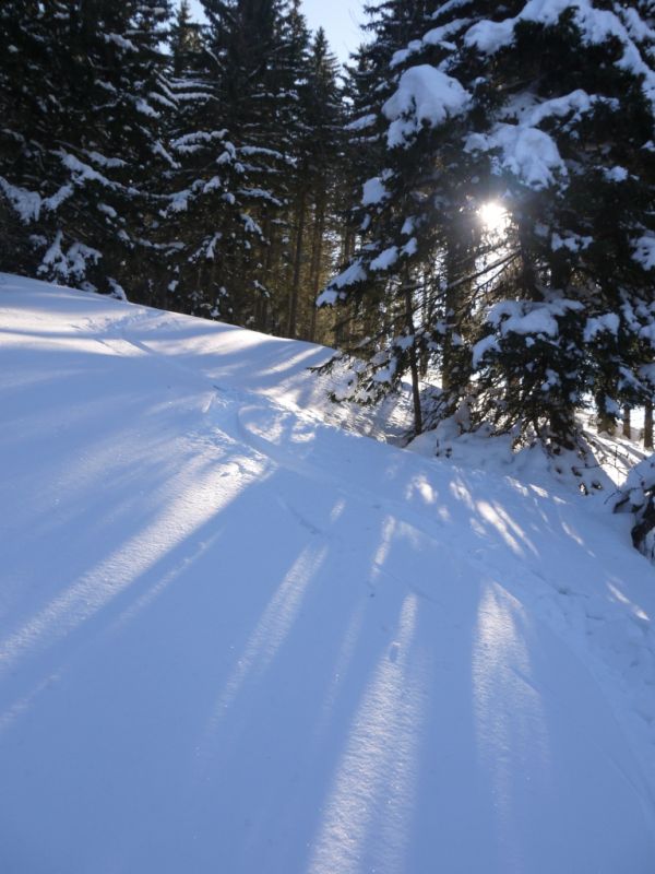 La neige en versant Est,devient croutée au soleil, l'accès au plateau est une véritable piste bien damée, la forêt en versant ouest reste extraordinaire,au retour pour éviter de suivre la piste forestière, ça vaut le coup de remonter sur 30 m de dénivellation la bosse des Coins puis plein est jusqu'au parking (complet vers 11 h 30 : énormément de monde en raquettes)