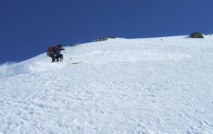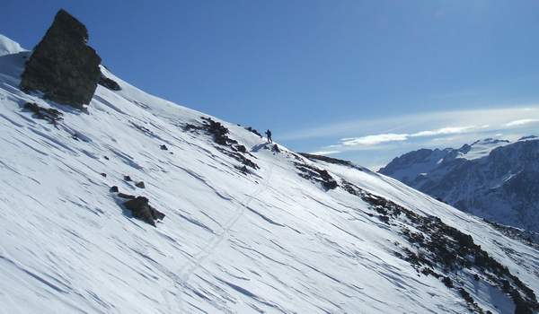 Montée par le rif de la lanterne jusqu'au point coté 2785 (antenne). Descente versant est jusque vers 2300m puis remontée au col 2661, antécime cotée 2713 et col du Chardonnet. De là, on tire à droite toute pour rejoindre la belle pente située à l'aplomb d'une ancienne mine. Descente enfin sur les chalet de l'alpe du lauzet.