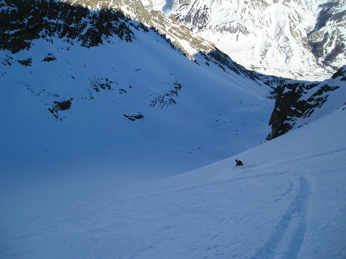 Quantité de poudre dense importante en nord assez physique à skier avec un fond dur bien présent. Petites plaques au début du couloir nord.