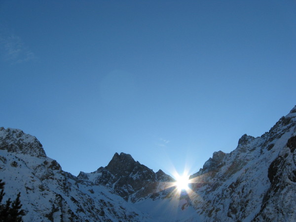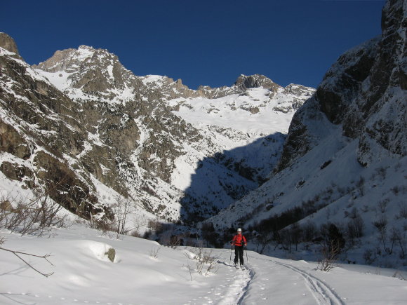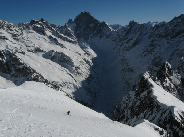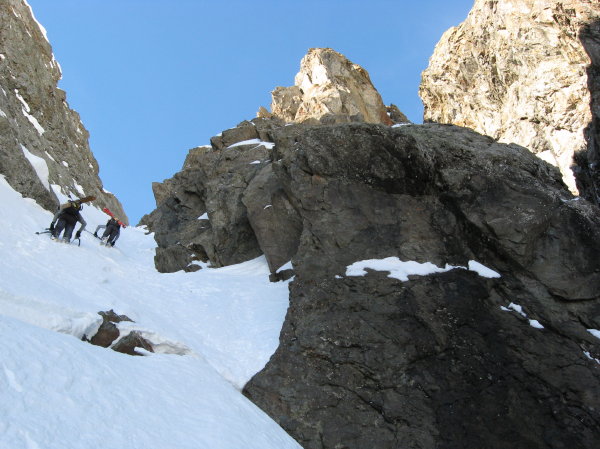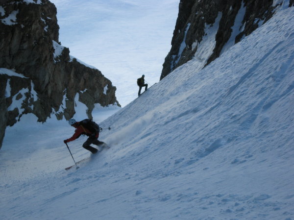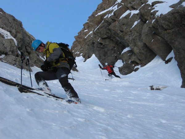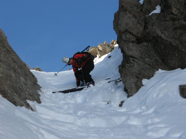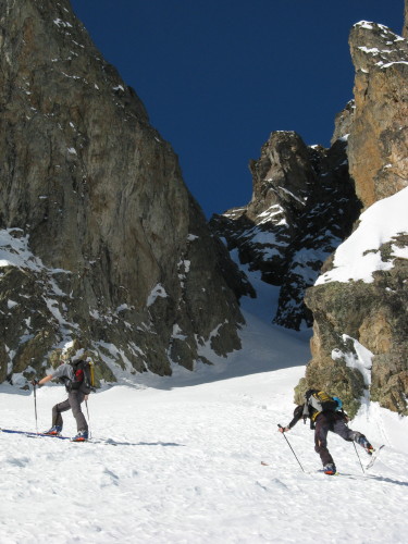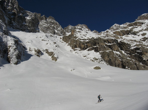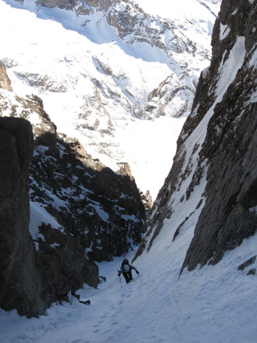 Superbe sortie inspirée par Manu vendredi lorsque l'on cherchait une destination pour le samedi. Merci pour l'idée. Tous les ingrédients recherchés ce jour étaient présents: soleil, douceur, solitude, vallon sauvage, couloir bien encaissé avec une ambiance qui rappelle la brèche de Gargan, mais en plus raide sur la fin (également les petites purges de glaçons tombant de la rive gauche pour pimenter la montée), bonne neige dans le couloir et dans les pentes d'accès. Le seul regret est d'être partis un peu tard: les pentes d'accès et le bas du couloir étaient déjà repassés à l'ombre lors de la descente et la neige bien transformée le matin (dès 10h) avait commencé à regeler (franchement dans le bas du couloir donnant une croute glacée avec grip limite, un peu moins dans les pentes en dessous réservant encore du bon ski quoique physique par endroits).