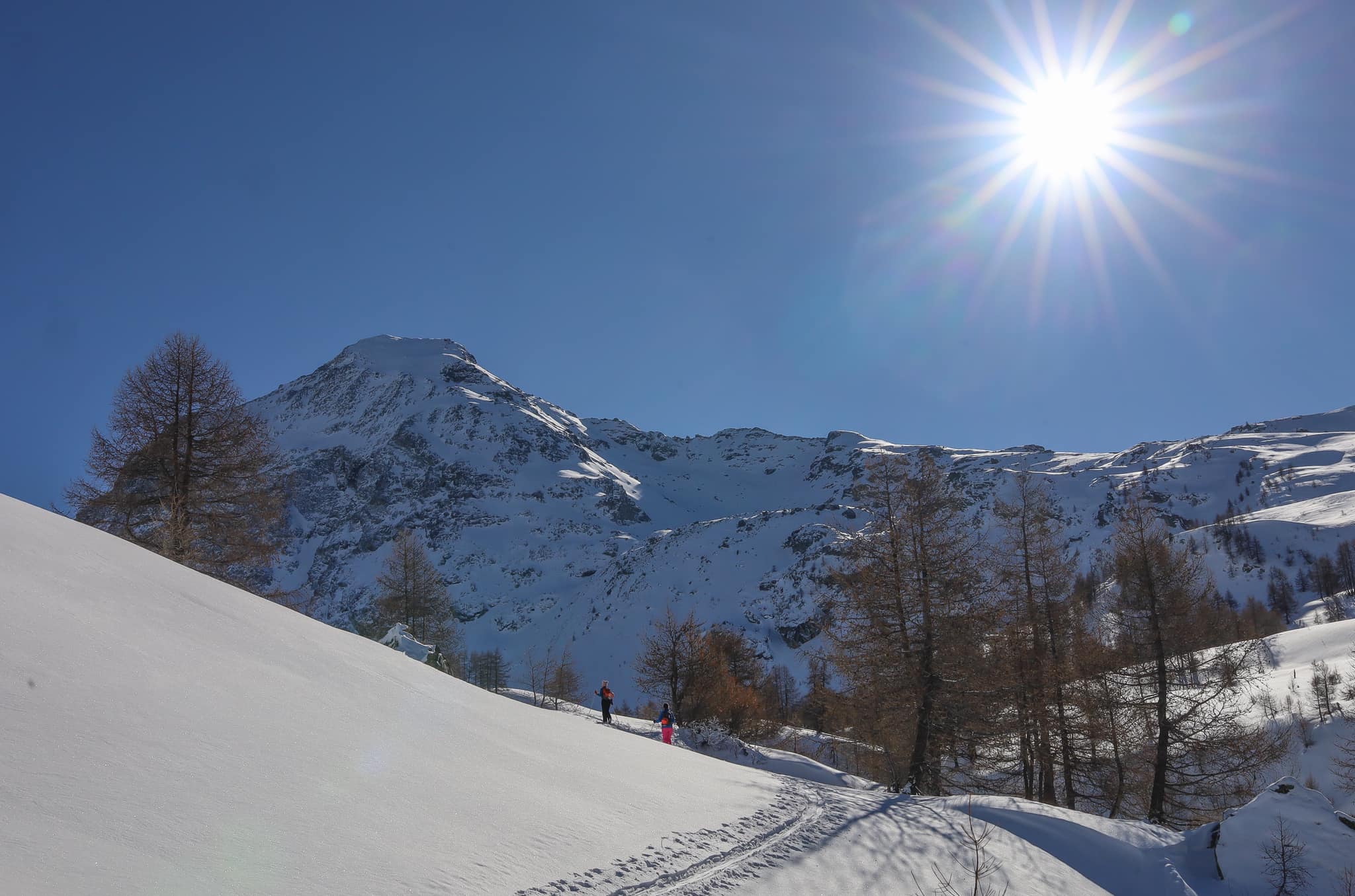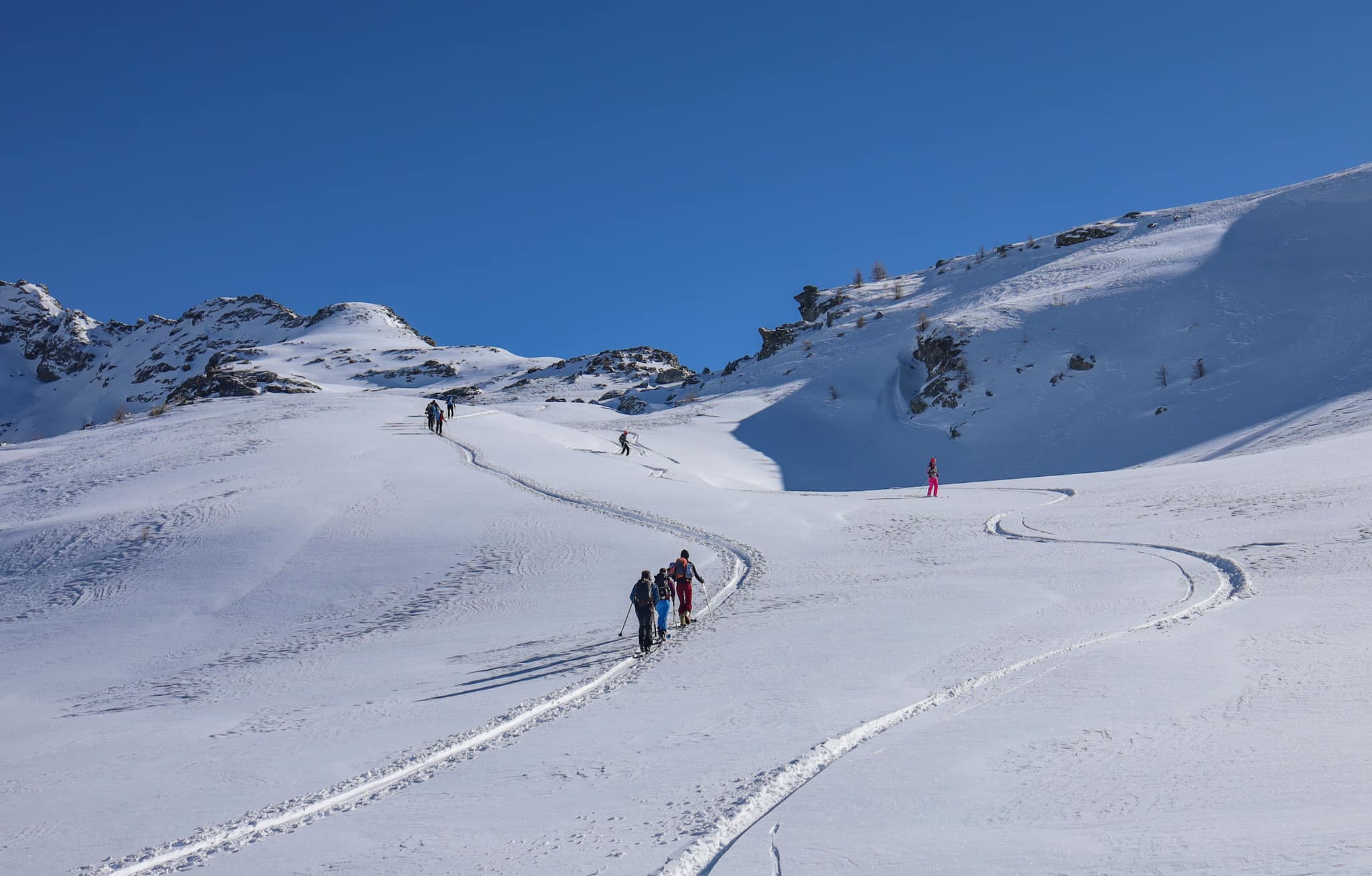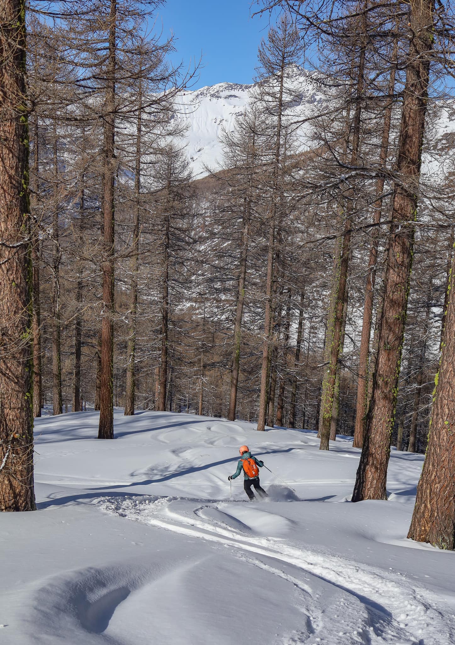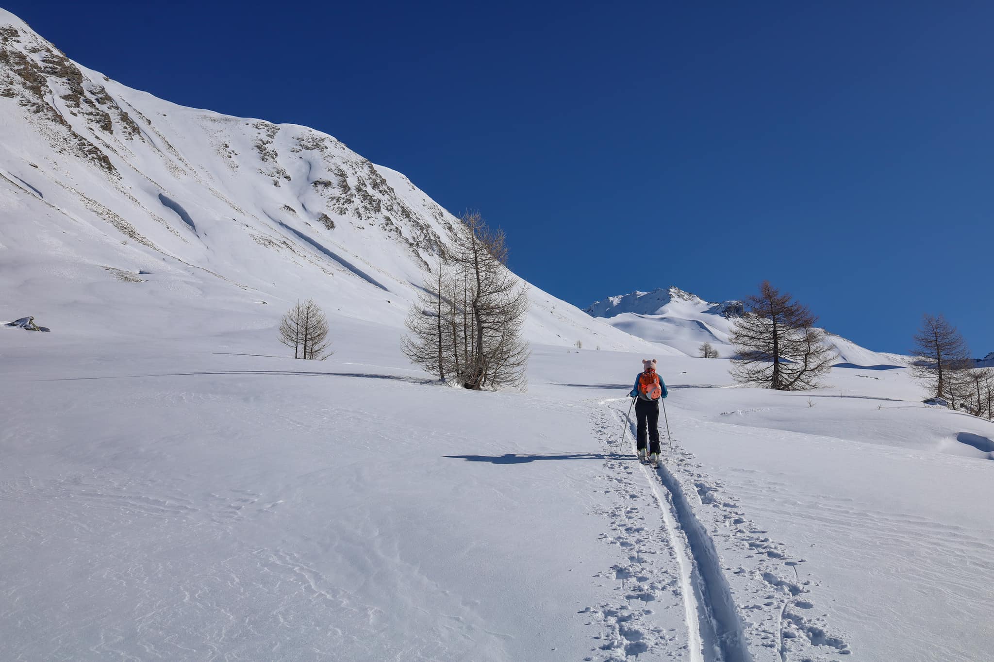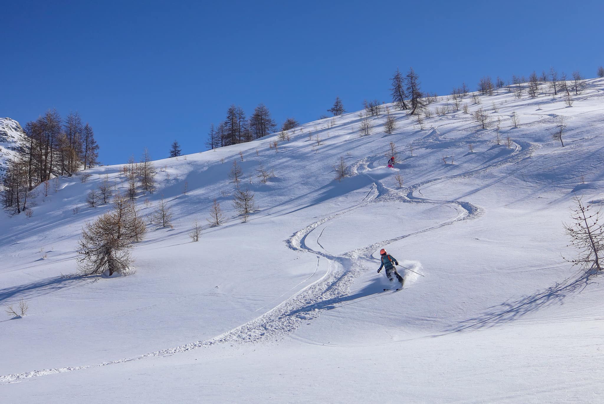Neige un peu moins bonne que la veille (cause vent partie haute et trafolée partie basse) mais globalement du bon ski et, mis à part un groupe assez nombreux qui arrive lorsqu'on commence à descendre, pas d'autre randonneur ce jour. C'est pourtant une ultra classique dans le niveau 2.