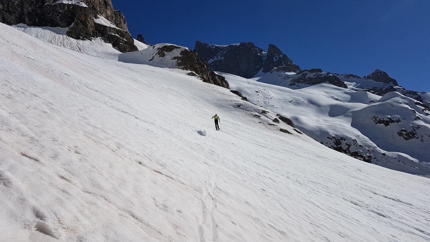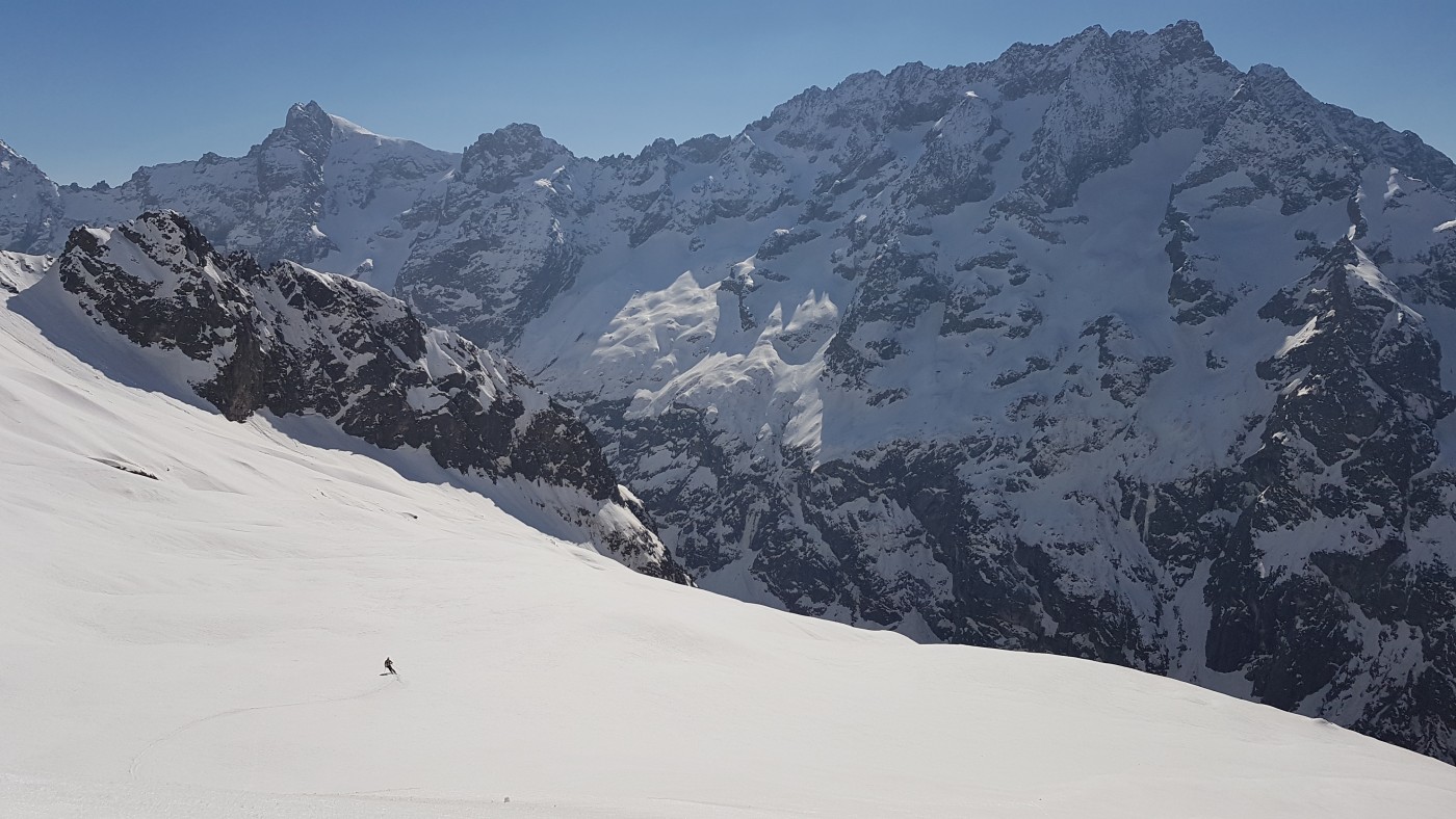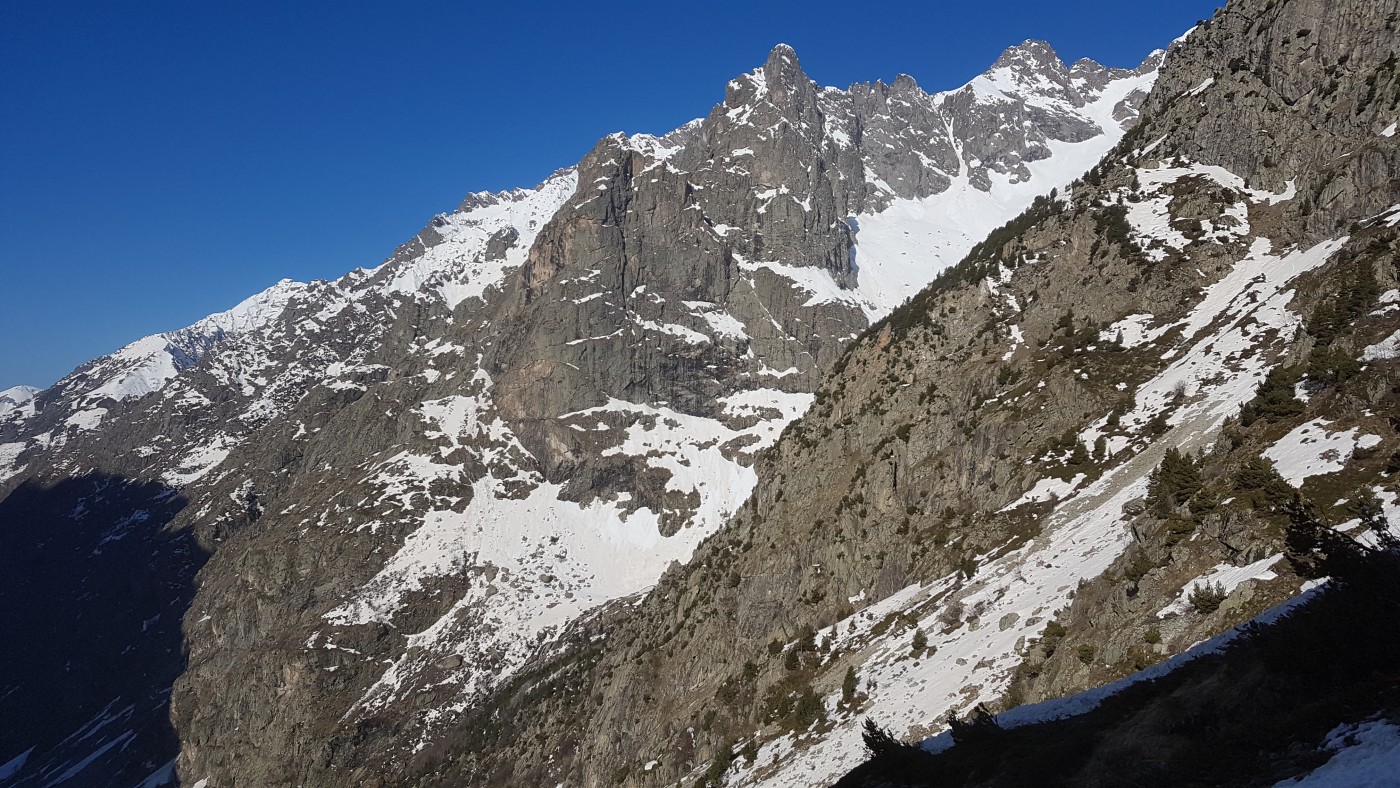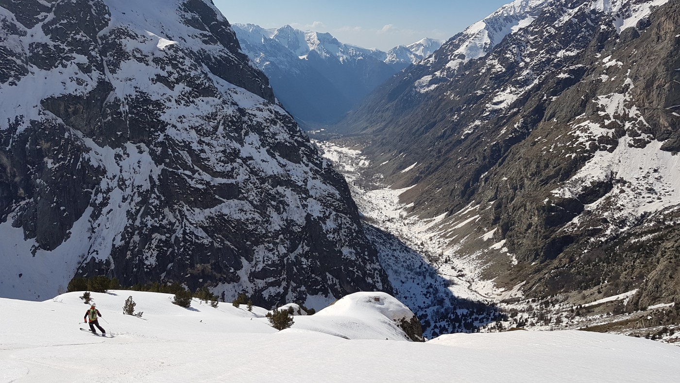 Aucun de nous deux n'avait encore visité le Grand Vallon, il est à l'égal des ses voisins et sans doute encore moins visité avec cette vire d'accès pourtant pas si retord. Vue imprenable sur le panneau Turbat-Souffles et alentours qui reveillent quelques souvenirs. Approche très correcte, hormis une section de 300m sèche, et quelques passage de ruisseau, retour skis au pied à la voiture (sortie du village), mais ça va pas durer.