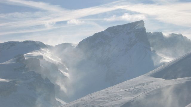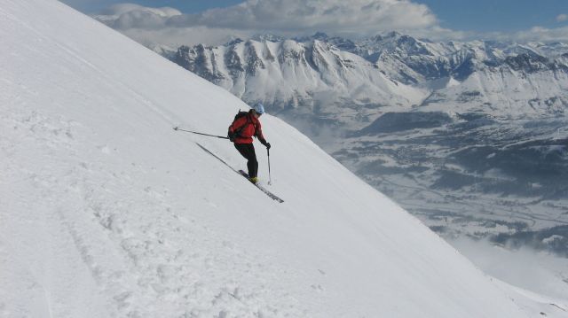 Les versants N sont vraiment déplumés et bétonnés par le vent, plus aucune trace de poudre en versant froid mais du grain fin béton.