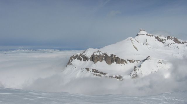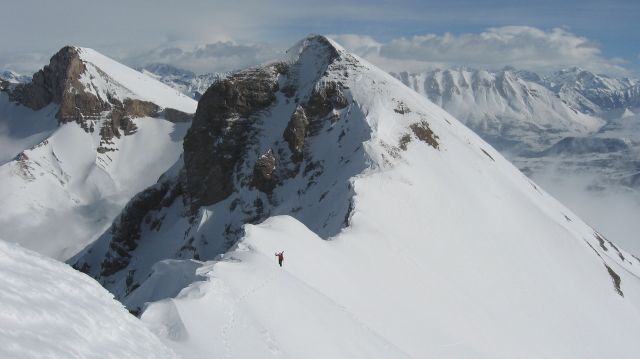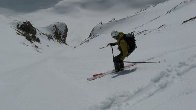 Partis dans les nuages du col , nous y croyons quand même et bien nous en a pris car nous avons profité de belles éclaircies. Descente du couloir au soleil 1/2 h avant que les nuages ne reviennent couvrir les sommets. Hold up météo! Plus de détails [ici->http://olilene.over-blog.com/article-28283118.html].