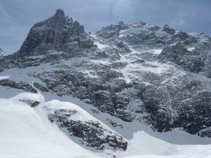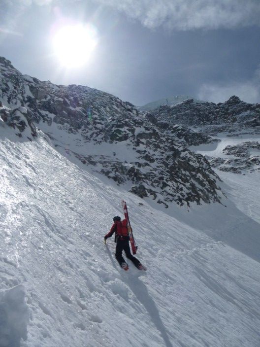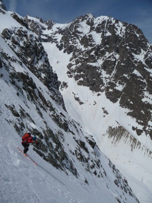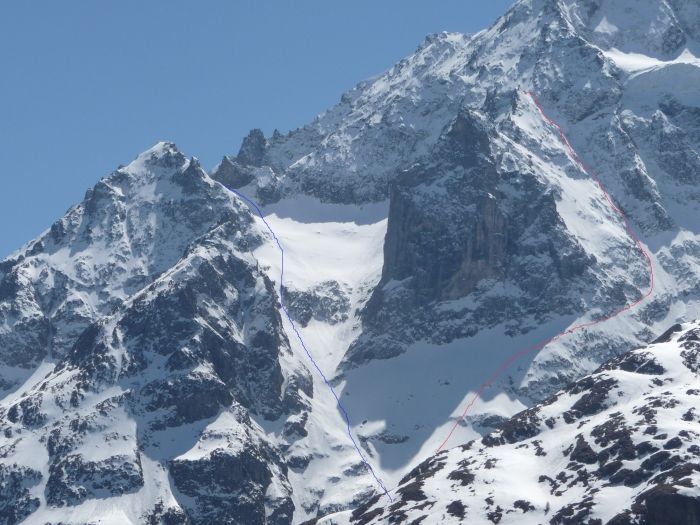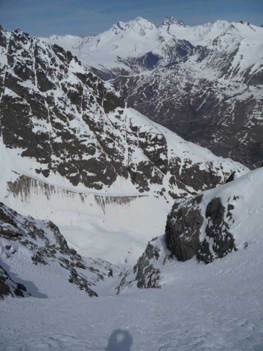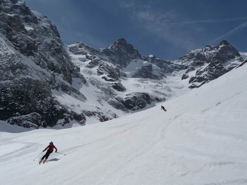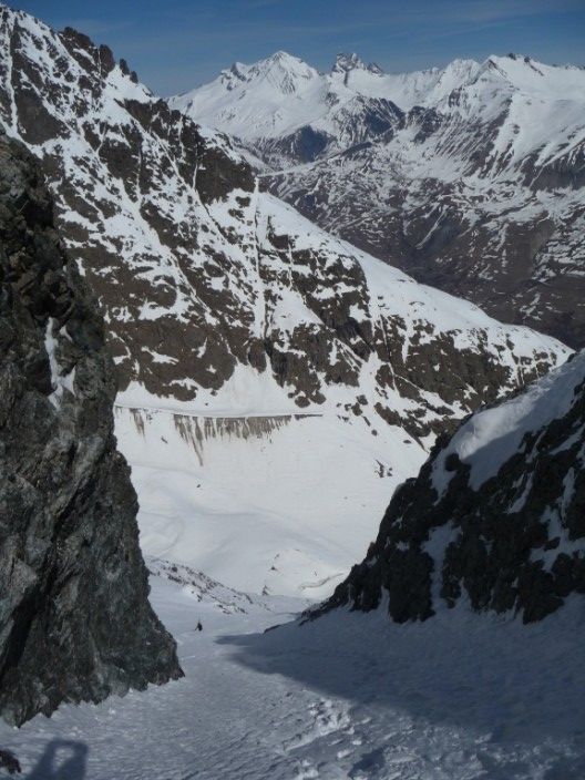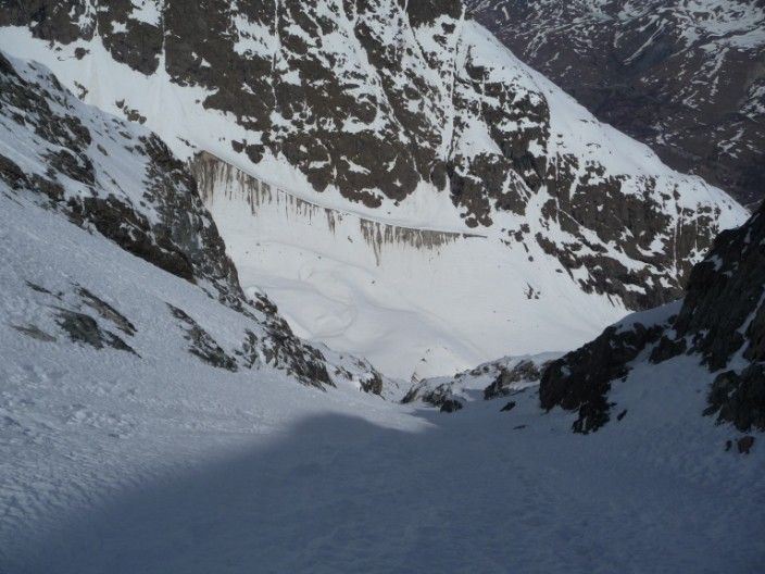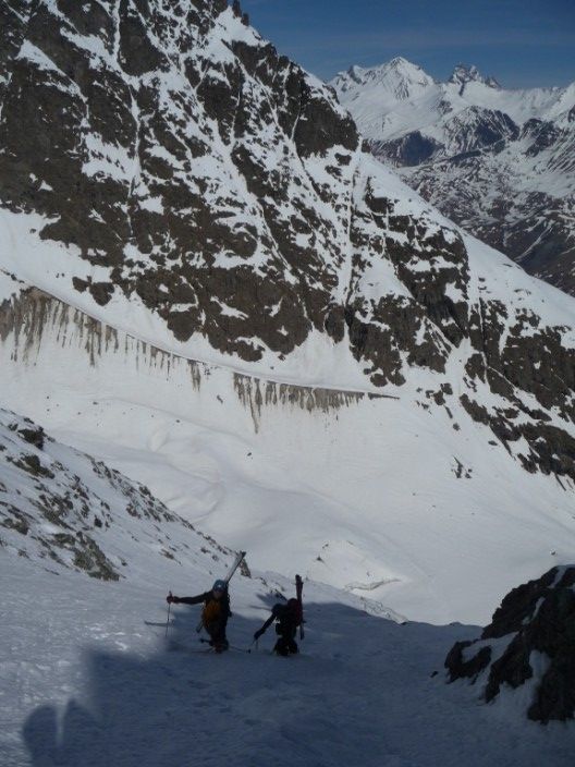 Après une petite ballade à la brêche du peigne, en descendant, on se retrouve dans la traversée ; donc autant rentabiliser le déplacement en allant découvrir ce couloir... Tout d'abord, il faut impérativement des conditions stables, car la traversée et tout le reste de la course est exposée au dessus d'une barre (E4). Après la traversée, le couloir est rectiligne, et reserve une belle ambiance digne du grand Oisans sauvage comme on les aime ! Traversée de 2400 à 2500m, puis petit 45 entre 2500 et 2600, puis ça s'excite au dessus jusqu'à 3050m, 5.2