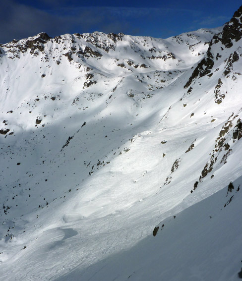 Une possibilité parmi d'autres de skier ce versant froid en hiver quand le pas du Pin et l'épaule sud sont sur-tracées.