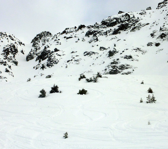 A droite de C15.2, un cheminement en S atteint la crête un peu au sud et un peu plus haut que le pas du pin (env. 2230 m). C'est plus raide et plus expo avec une section à 45°. Un petit 4.2. Je me suis arrêté 15 m sous la crête. C'était surement skiable mais à monter sans crampons ni piolet, la chaussure n'enfonçait plus dans le neige. Plus bas, de belles zones de poudre encore vierge entre les zones trafolées. Plus bas, peu de possibiltés d'éviter le bordercross (en bon état).