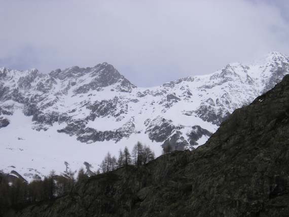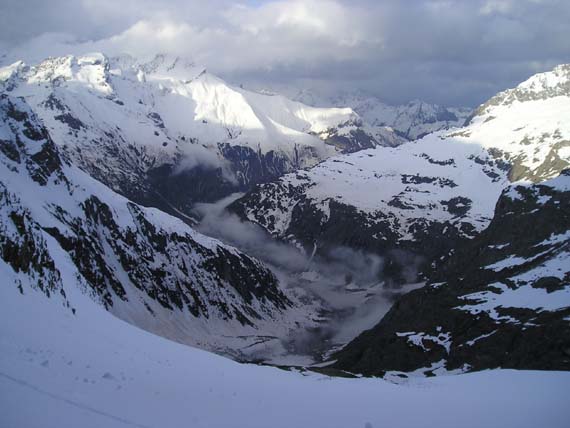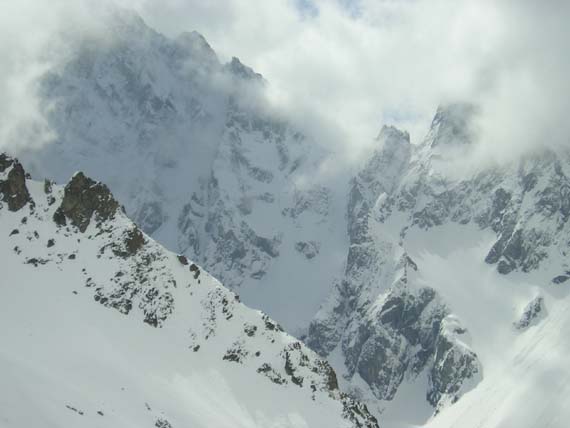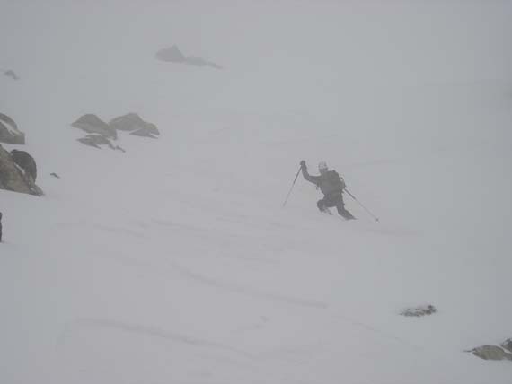 Variante de H9: on a pris le passage étroit indiqué dans le topo puis on a rejoint l'itinéraire de base par un petit couloir à 40-45 sur 100m. A ce niveau là nous étions dans les nuages et ne voyant pas la crête nous avons pris unn petit couloir qui ne débouche pas à la crête: mur rocheux. C'est pas grave de toute façon c'était rapé pour la vue sur la crete...Par contre la pente était bien raide, 200m à 40-45 avec un final très raide à 50-55° sur 60m. (cot4.3,/5.1?)