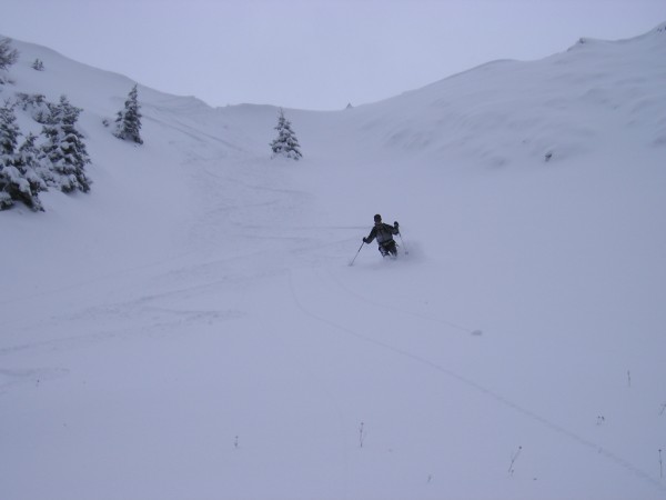 Montée par les pistes de ski jusqu''au point coté 1947 sur la crête du grand Serre. Descente plein nord dans une bonne petite combe à l'ouest du point 1947, où la sous couche est bien présente (accumulations dues au vent de Sud) et permet du bon ski sans retenue.