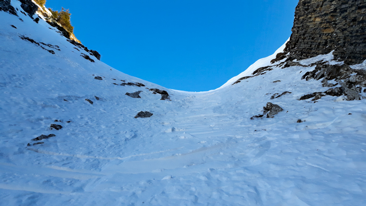 Dans le couloir, entrée poudreuse sur 30 m puis passage dur sur 10-15m (rayonnement paroi rg).Plus bas l'axe est carton portant avec de la poudre (faces planes) sur les rives.