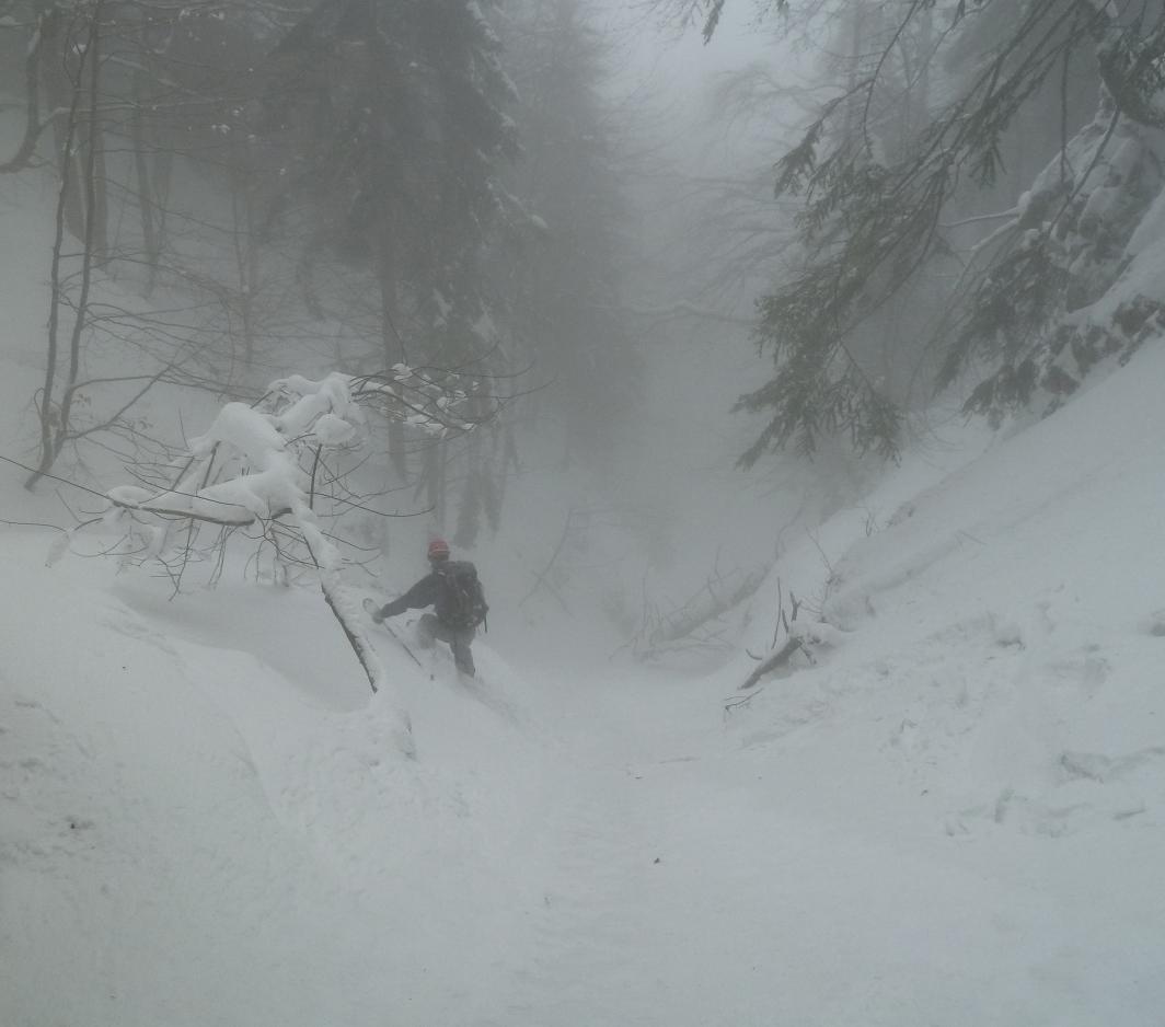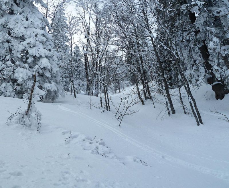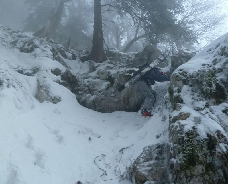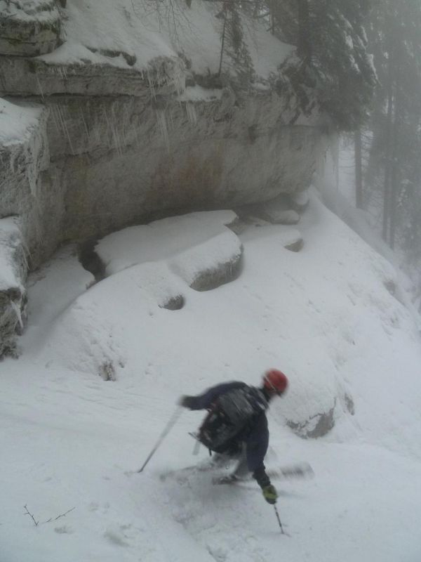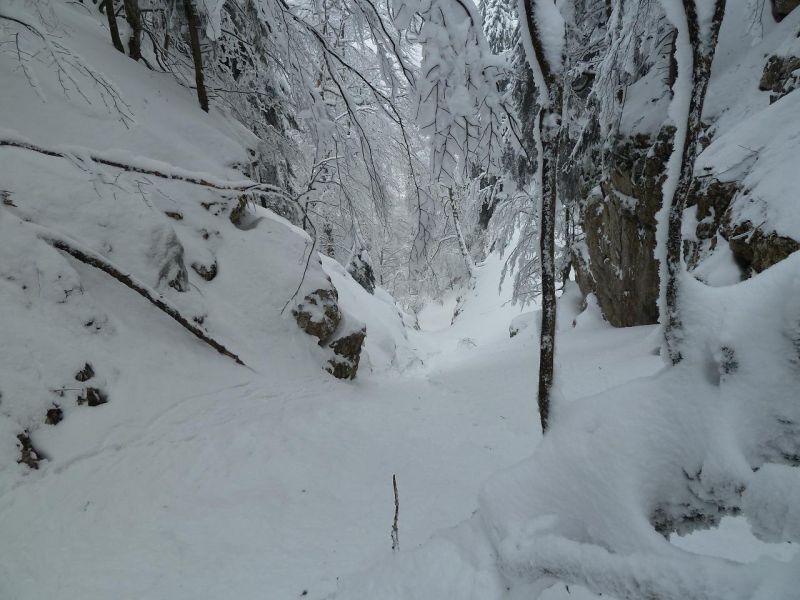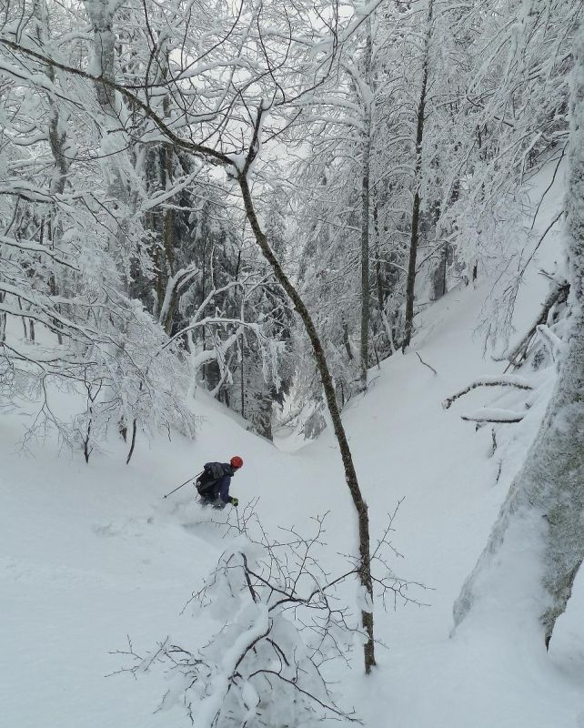 Montée B21. Du sommet, plonger versant est dans la belle forêt clairsemée. On traverse deux pistes successives puis la pente s'énerve avant une étroiture. Plus bas, le couloir butte sur un ressaut vertical -> trouver une issue de secours en rive droite.