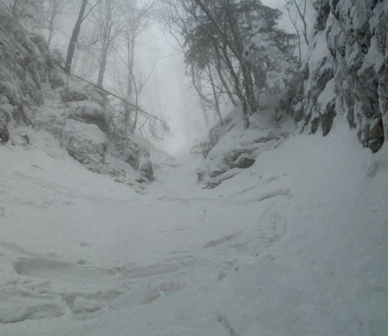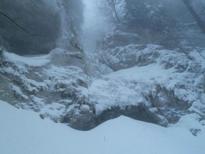 Nous avions échoué sur le grand ressaut lors d'une première exploration et étions donc repartis en sens inverse, faute de corde pour un rappel (10 m). La deuxième exploration depuis le bas nous a livré le passage en rive droite évitant le rappel, mais pas le déchaussage. La neige fut plutôt mauvaise pour cette troisième et dernière, mais pour l'intégralité et dans le bon sens...