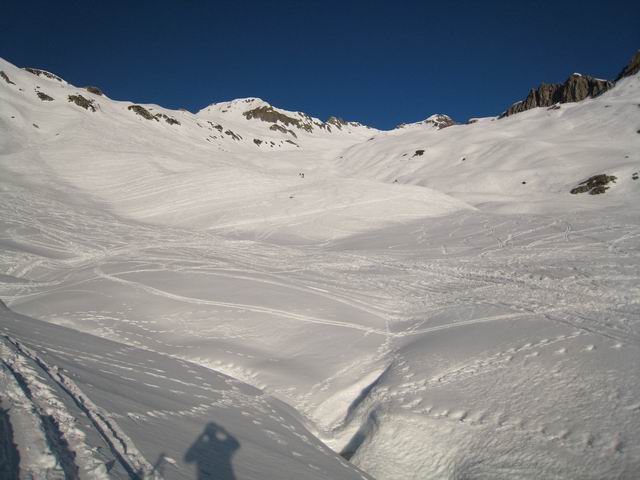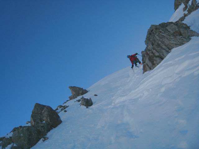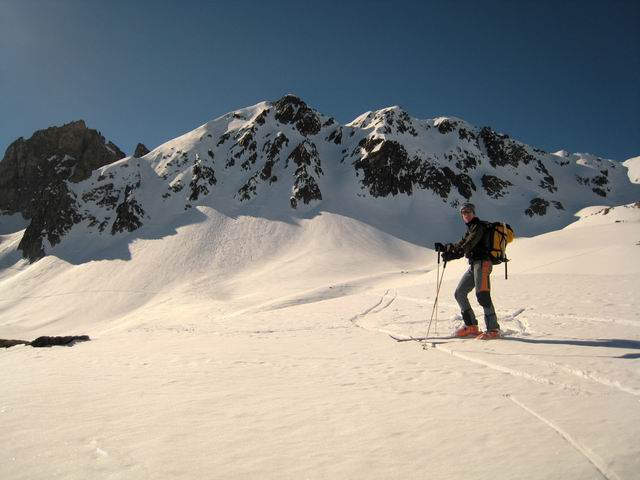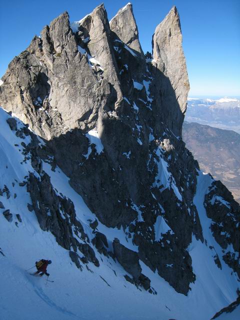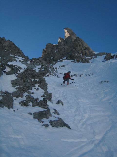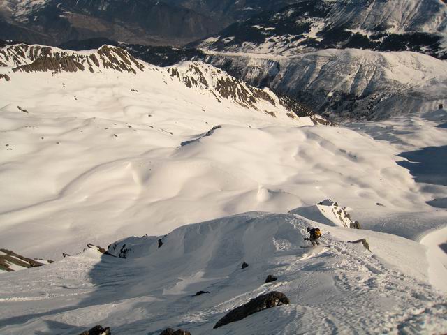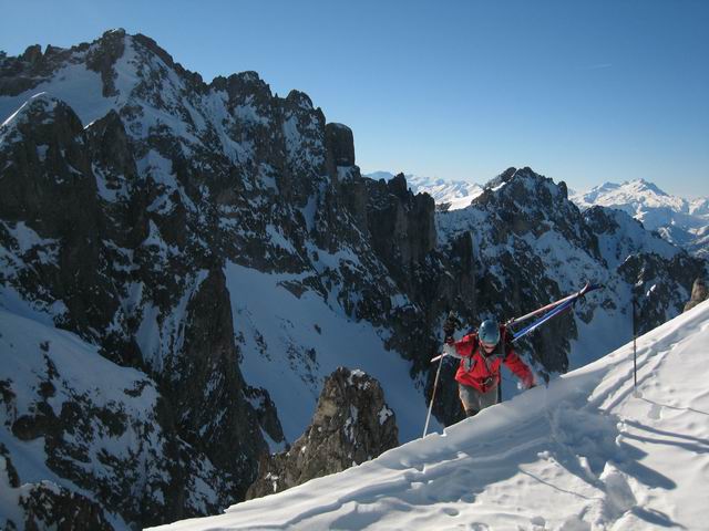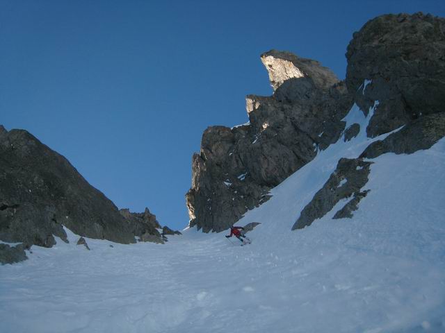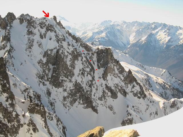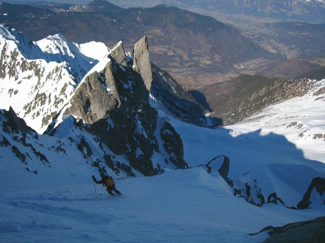 Après 2 sorties exotiques dans les Ecrins, le contraste est saisissant quand on débarque à Celliers: la combe des Plans est un champ d'ornières ! Heureusement une fois passé en versant ouest de la ligne de crêtes, on retrouve la tranquillité. Le couloir NW gagnerait à être un peu mieux rempli, mais en l'état ça passe. Et avec les bonnes conditions de ce jour, il ne fallait pas s'en priver