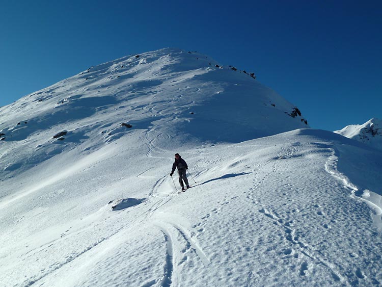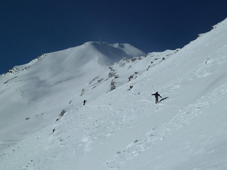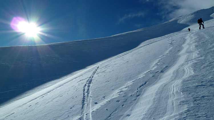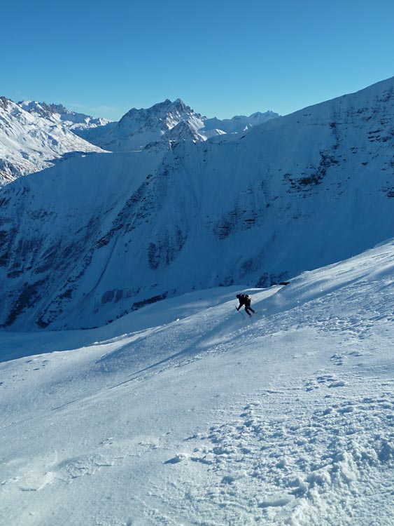 Les doutes liés à la nivo nous ont fait revoir le programme initial, et finalement permis de tourner en rond autour du bien nommé Crey Rond, dans des pentes modestes. Ce dernier propose un versant est intéressant, dégagé et régulier sur 1000m. De quoi se réchauffer le cuissot sur la neige dure.