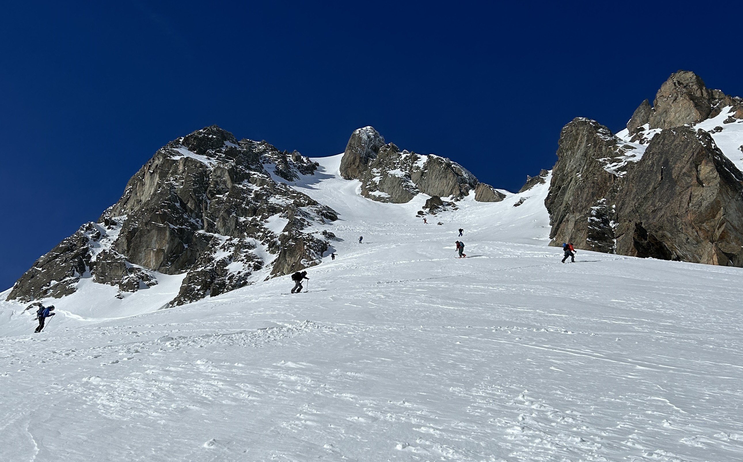 Les dernières chutes de neige ont fait du bien dans le secteur en termes de skiabilité. Bonne poudreuse dans la descente du col des Crochues et dans le haut du vallon de Bérard jusqu'au plat sous le refuge. Le bas du vallon s'est amélioré aussi mais la sous-couche dure et les cailloux ne sont pas loin. On a déchaussé à la cascade de Bérard et rechaussé à la Poya pour les derniers mètres jusqu'à l'hôtel du Buet.