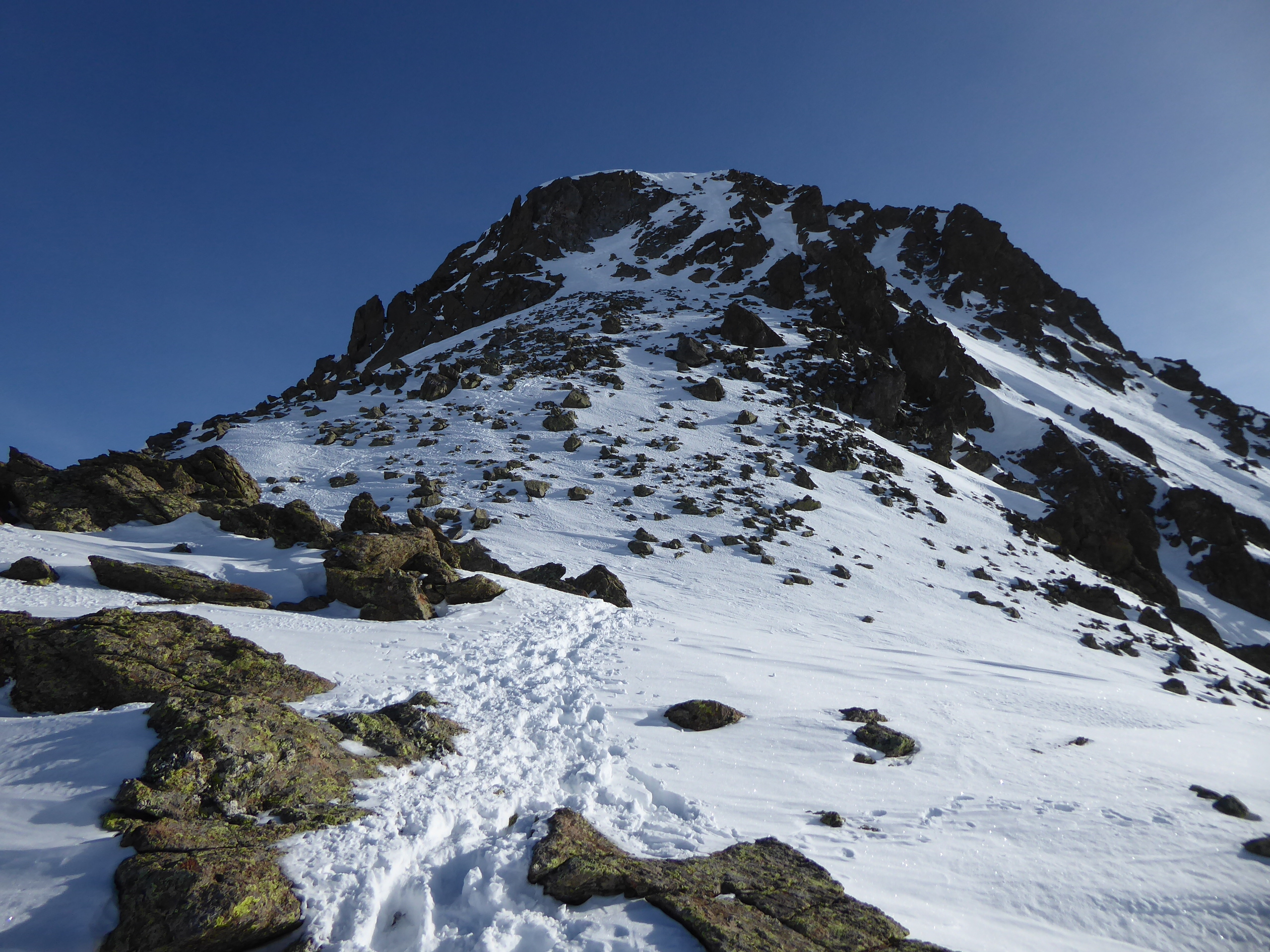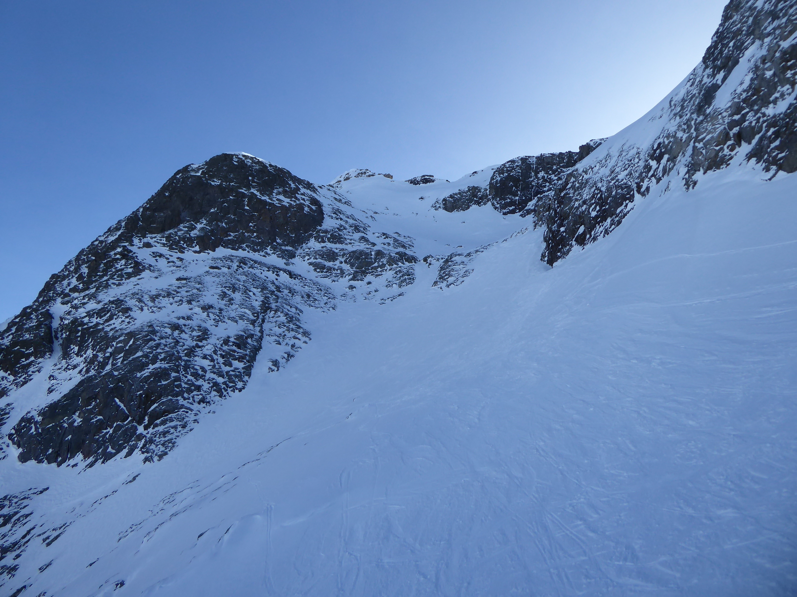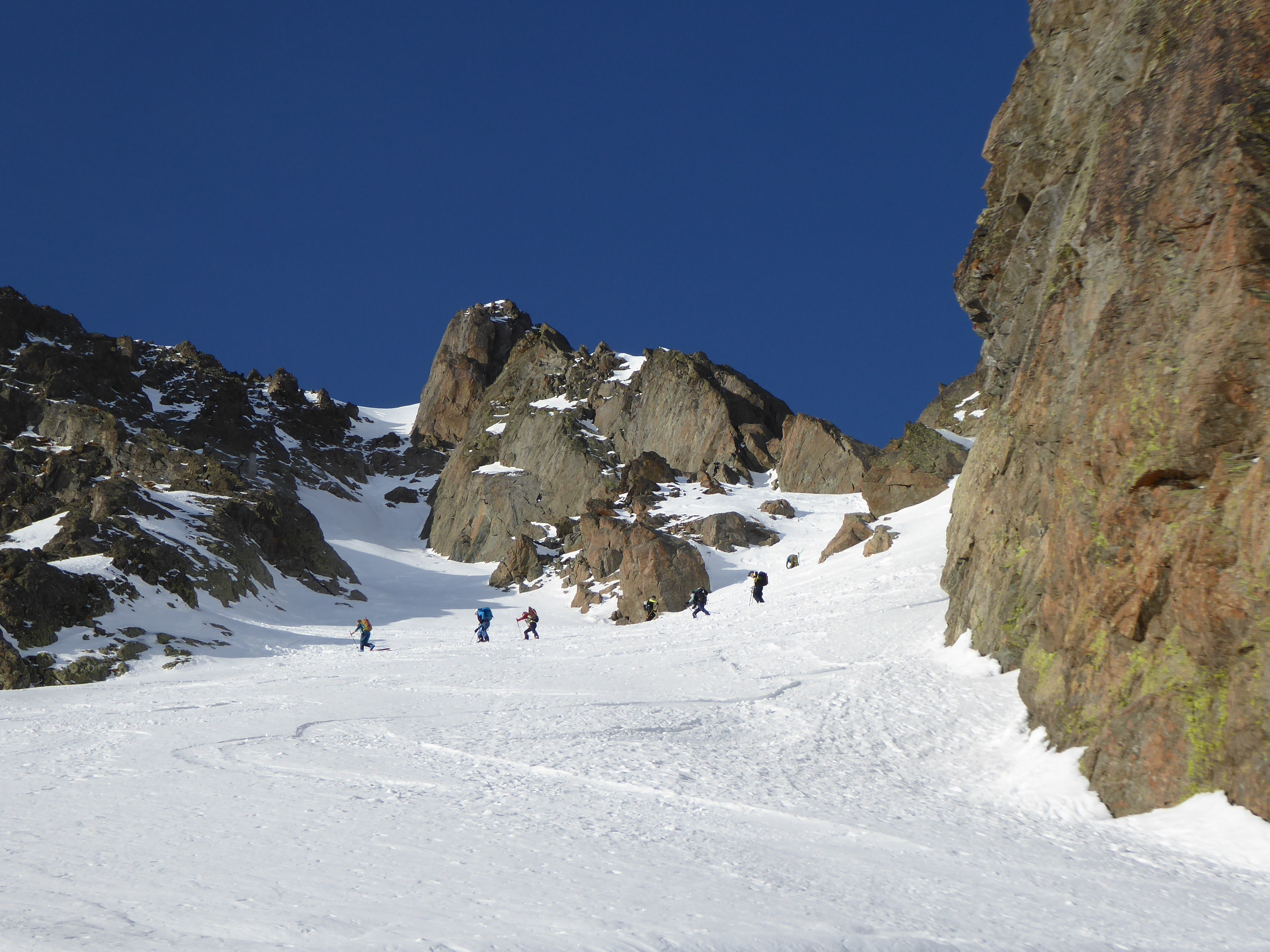 Tout l'itinéraire était tracé : bonnes marches pour le col des Crochues et dans le couloir sud de la pointe Alphonse Favre. Assez bonnes conditions de ski dans le haut du vallon de Bérard (vieille poudre). Sous le refuge, la neige est pistée. La descente classique en rive droite passe bien. Quelques cailloux apparaissent à partir de la buvette de la cascade de Bérard. Le passage des premières barres dans le haut du glacier du Mort est en neige dure, gelée.