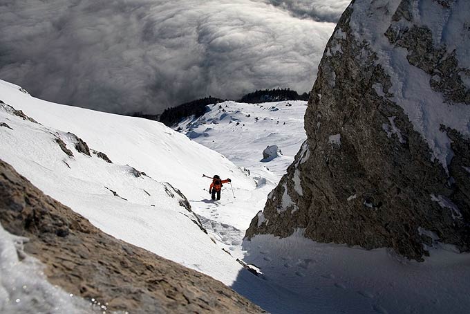Le vent a sévit là-aussi au-dessus de la forêt, ainsi que le brouillard givrant des deux jours passés ayant glacé certaines zones entre 1700 et 1900 m. Accumulations locales pouvant partir sous forme de petites plaques comme nous l'avons détecté dans le haut du couloir en rive droite. Par précaution, nous sommes restés rive gauche sur cette portion. 90% de la descente est en très bonne neige pour le ski.
