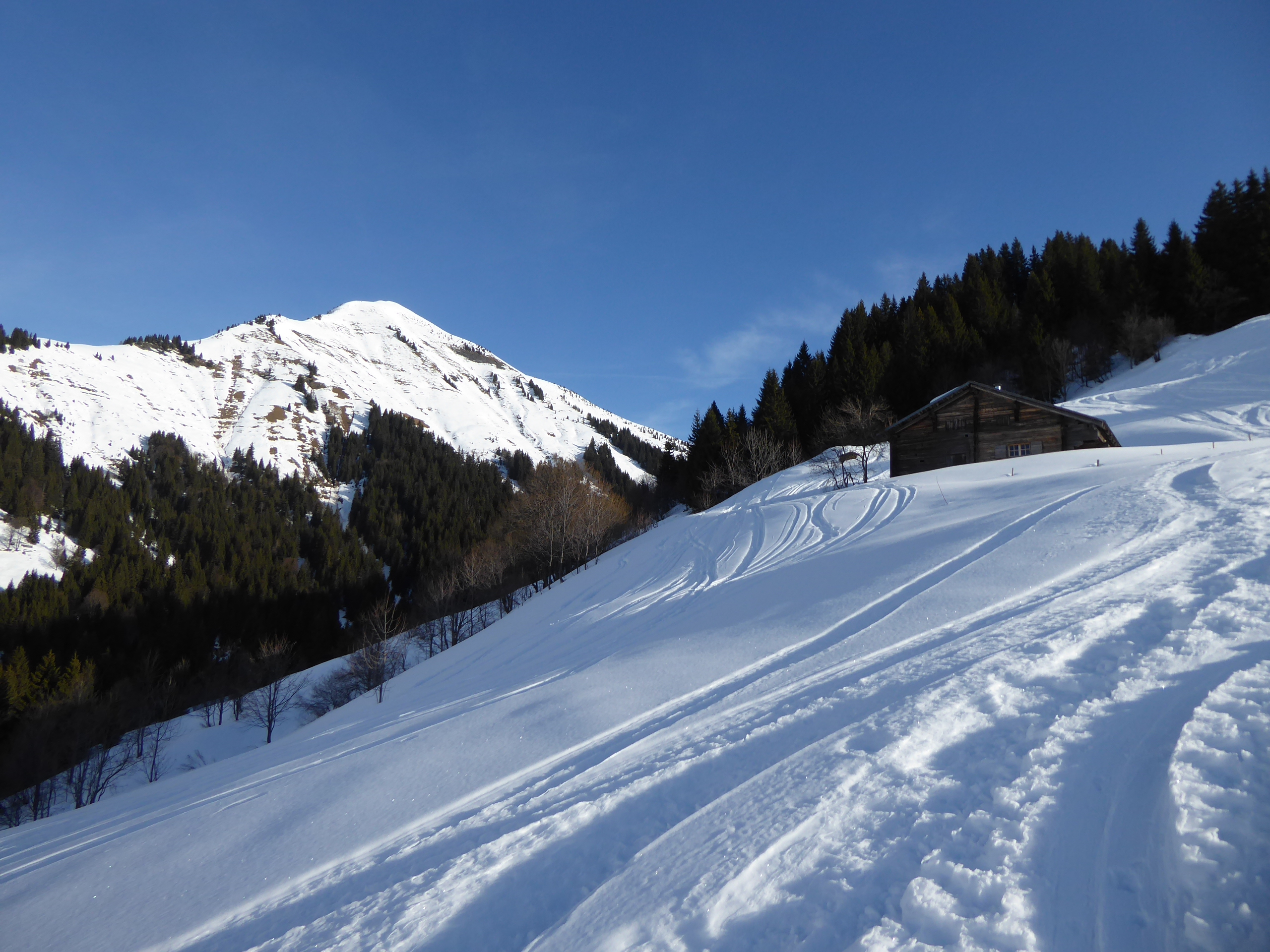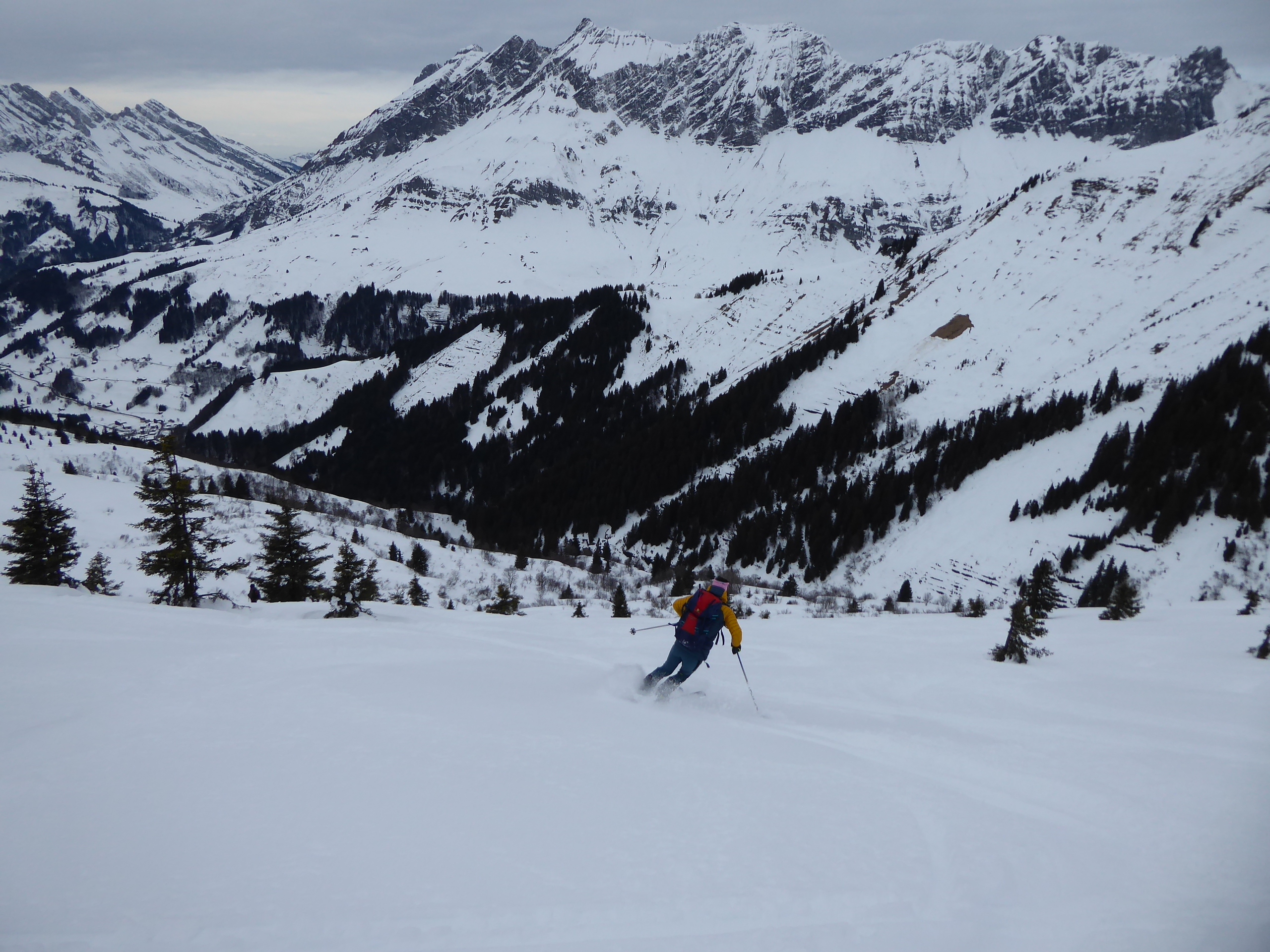 Neige croutée à dure dans les orientations sud, pas de dégel aujourd'hui. Neige encore poudreuse dans les orientations N. Pas de signe d'instabilité.