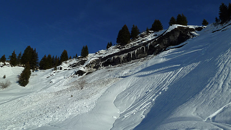 Nombreux départs au terrain observés en versant sud raide (Roualle, Torche...), ou reptation sur les pentes herbeuses : ça a purgé de partout sur "l'envers" des Aravis.