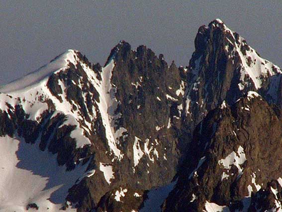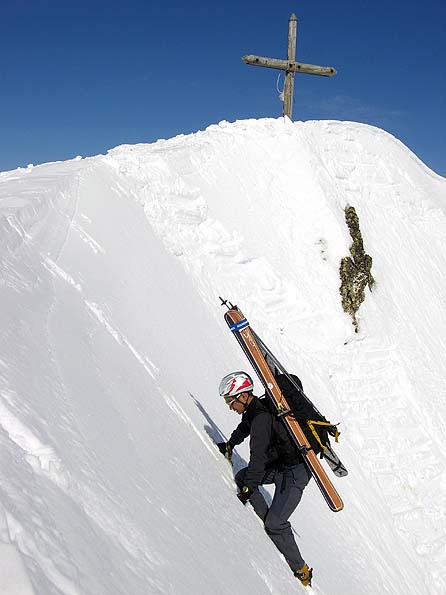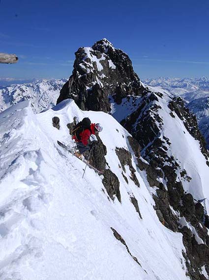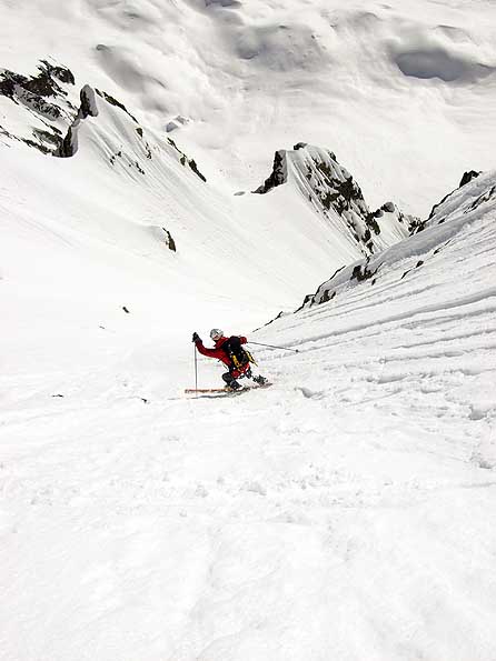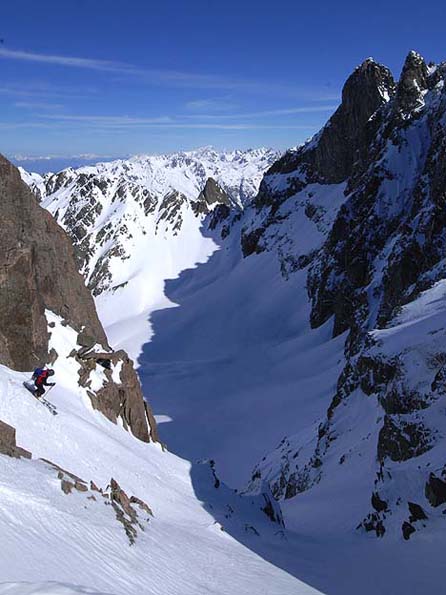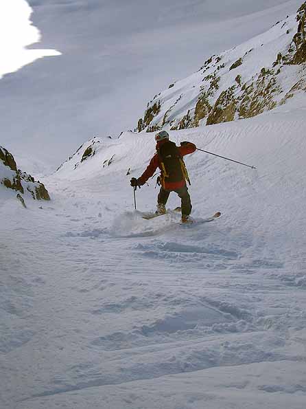 Le couloir suspendu de la Croix est bien visible de tous les sommets des Ecrins et des Rousses. C'est très raide (55°) en haut où Nico a posé des virages sous la corniche de la Croix dans une neige assez piégeuse pendant que je dérapais prudemment. Le reste est du style de GL Domène W en plus soutenu question pente (50°/200). En bas du couloir, y'a une barre de 150 m, y'a plus qu'à le remonter. Un guide m'avait dit : pour moi y'a deux cotations : celle où tu peux tomber et celle où tu peux pas. Là, on était dans la deuxième catégorie ! En résumé, une belle ambiance dans ce large couloir qui reste une saloperie de peu d'intérêt au régard de l'exposition. Nous avions un programme d'enchainement avec le Couttet, abandonné compte tenu du verglas observé dans les pentes nord raides où la poudre n'a pas souvent collé sur cette croûte de pluie de janvier. Ce phénomène, nous l'avons observé dans le haut des rochers Rouges mais cela ne nous a pas posé de problème pour le descendre étant donné la différence de niveau avec le précédent.