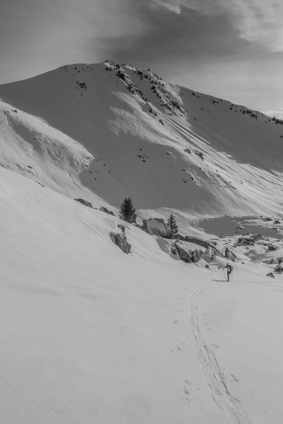 Un peu de monde à midi à la dernière descente. Pluralité des ascensionnistes : ski de rando, raquettes, chaussures d'alpi, enfants à pied, tractés, luges, chiens, chats, lapins... Le manteau est prêt pour accueillir la prochaine couche.