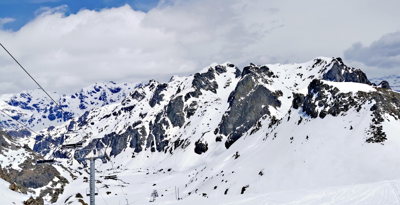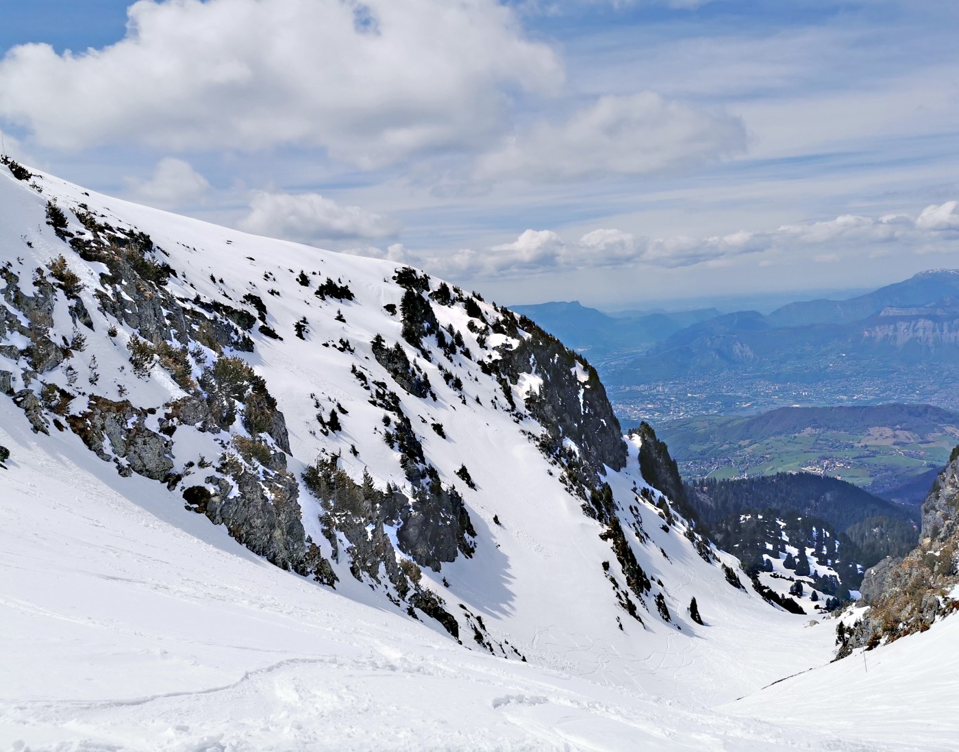 En partant à la bonne heure (11h00) je n'ai eu qu'un peu de neige dure dans la première montée au-dessus de 1900. Ensuite la couverture nuageuse et un petit vent frais ont permis d'évoluer sur des neiges très agréables et pas collantes (sauf sud >30°) sans souffrir de la chaleur. Le départ du Recoin peut tenir encore quelque temps. Départ skis au pieds condamné à Casserousse et bientôt Bachat Bouloud.