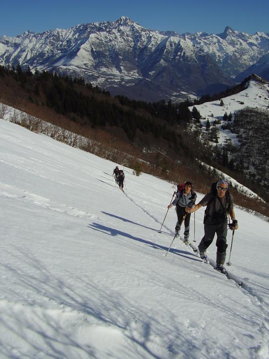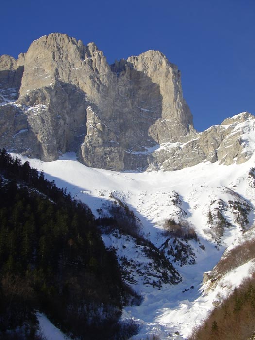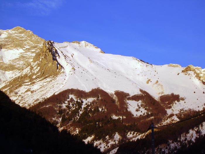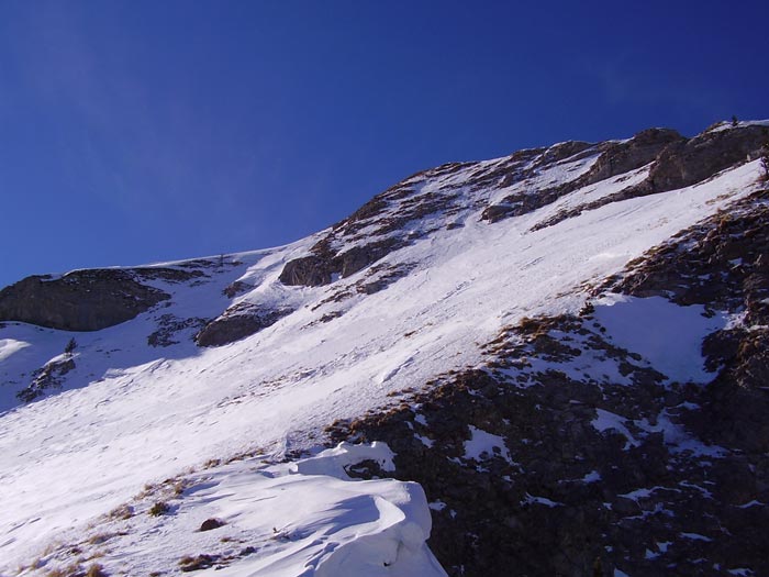 Petite correction au topo : c'est en rive droite du ruisseau des Auberges qu'on suit une piste confortable qui passe en rive gauche à 1290 m (cette partie de la piste n'apparaît pas sur la carte). De la sorte, on se retrouve très facilement au pied de la face, où il faut trouver un passage au centre dans la végétation vers 1500 pour gagner la large face finale. On a le choix pour la descente, selon le type de neige recherchée.