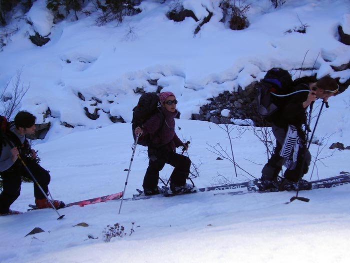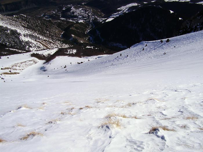 Après que j'eus effectué la coupe, Christophe a estimé qu'il y avait un peu de risque et a proposé à ses amis d'en rester là, vers 1800. J'ai quand même continué, jusque vers 2030, juste à la lisière de la partie rocheuse du sommet, sur la droite. Je ne voulais pas les faire trop attendre, et la partie finale était mal enneigée, voire assez risquée : c'est donc là que j'ai chaussé. Il était 12h30, un peu tard pour descendre dans la partie réchauffée en RG. Je suis donc passé en RD et il m'a fallu slalomer un peu entre les zones plaquées pour trouver un peu de simili-poudre. Après 1800, la neige devenait bien humide mais encore bien skiable. Le meilleur était sur la piste vers le bas (neige froide très glissante). Très jolie course qu'il faudra refaire en transfo.