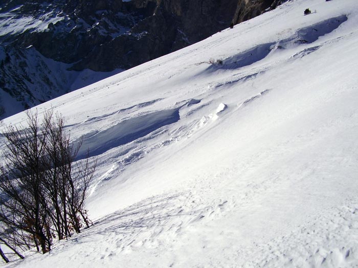 Une coupe dans la face à 1750 m (pente environ 35°) révèle une couche supérieure de grains fins commençant à développer une cohésion de frittage posée sur une vieille couche transfo dure (grains ronds) constituant un bon plan de glissement. Je l'ai testé et il faut à peine tirer pour que la couche supérieure se détache et glisse sur la vieille croûte de regel. En-dessous des 45 à 50 cm de grains ronds bien soudés, on trouve un peu de faces planes près du sol (petits rhododendrons). Une des combes de la RD de la face est bien remplie par une avalanche assez conséquente : départ sous la crête sommitale sur 10 cm max ayant entraîné la couche supérieure plus bas. Quelques passages plaqués mais sans sous-couche fragile entre 1850 et 1950 près du bord droit de la face. Idem du côté RG plus à l'ombre.