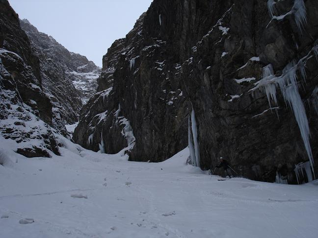 Le canyon dénivelle sur 700m, dont 500m à 40° en moyenne (en tenant compte de la sortie à 45° sur 30m). Nous estimons la cot à 4.3/E2, en tenant compte également de l'étroitesse et du caractère tortueux.