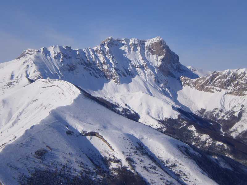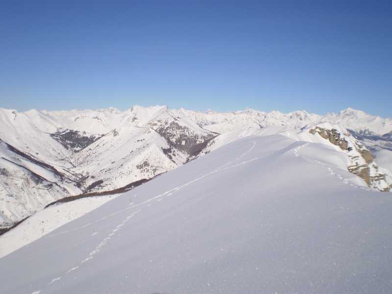 Départ du point 1232 sur la route de Rabou. Plein est vers la ferme de Rougier puis la croupe évidente sud-ouest. Passage raide sous des rochers (méfiance par conditions douteuses, possibilité de contourner par le sud) sous le point 1694. Fin agréable par l'arête confortable. Descente idem (aller-retour en peaux du point 1831 au sommet).