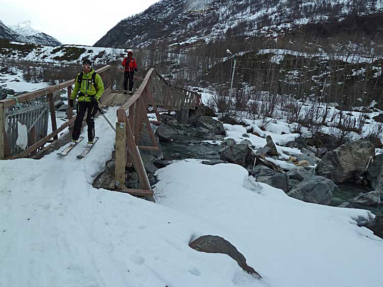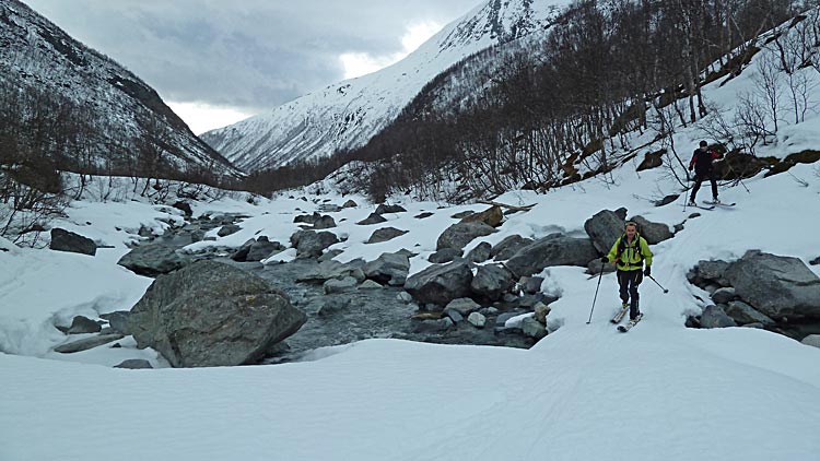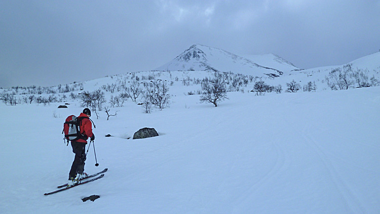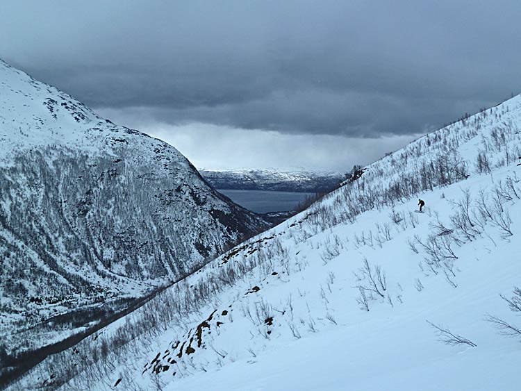 De Grønvoll, longue remontée (4km) rive droite de la Lyngsdalselva jusqu'à Varas où on part vers le sud pour faire cette belle pente peu raide régulière sur 800 m>> retour en coupant un peu dans les pentes nord dominant la Lyngsdalselva pour gratter de l'horizontale puis rive gauche