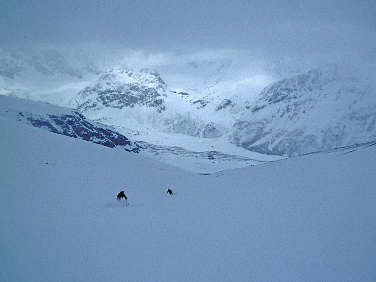 Quatrième jour dans les Alpes de Lyngen. On tente une incursion dans la partie sud de péninsule : c'est raté, cette partie du massif accroche les nuages plus facilement surtout quand les vents viennent du sud...