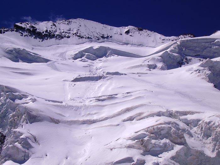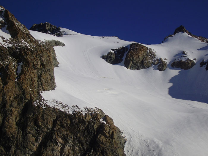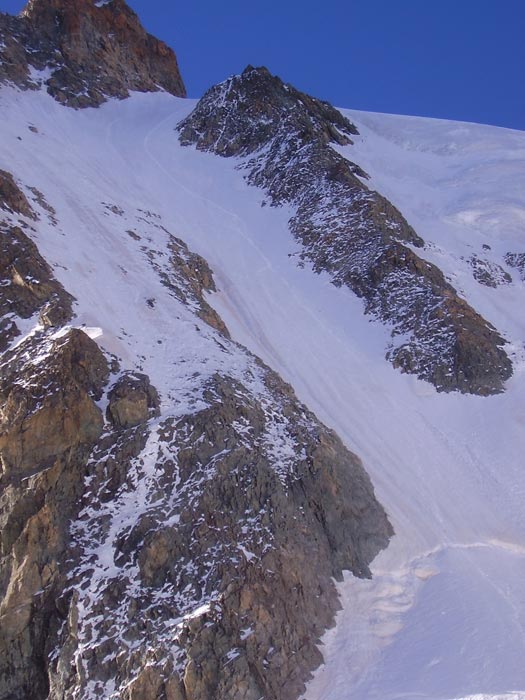 Toujours autant de risques de chutes de séracs complètement à droite en montant : heureusement, les traceurs ont eu la bonne idée de passer un peu plus à gauche, a priori à l'écart de la trajectoire. Un second secteur est aussi exposé sous la deuxième chute de séracs plus haut, comme le prouve une grosse coulée pas très praticable à skis à la descente. La neige récente qui a tout recouvert ne permet pas de bien juger des conditions dans la voie Coolidge : il est possible que le bas soit bientôt en glace.
