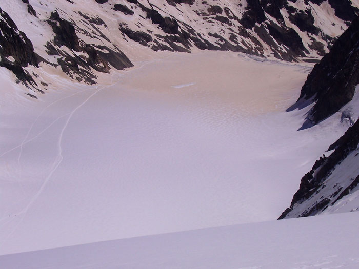 J'avais des envies de Barres (Écrins et Noire), mais j'ai préjugé de mes forces en partant du bas. Arrivé à la rimaye (un peu à droite du Coolidge, un couloir neigeux a été emprunté, à la montée et à la descente, par une quinzaine d'alpinistes), j'ai senti que je n'aurais pas assez de forces et que l'horaire ne serait plus tenu (il était quand même 10h30). Donc, consolation au dôme, que je n'ai pas regretté d'avoir skié, car c'est la première fois que je le vois intégralement en neige. La rimaye passe très facilement. C'est ma meilleure descente du dôme, avec une neige un poil liée en haut sous la rimaye, de la moquette au milieu vers midi et de la transfo à peine lourde en bas. Même le glacier en neige de printemps était encore bien skiant ! Info en passant : le couloir central du Pelvoux a été skié à vue par Hervé Degonon il y a 3 jours avec 2 rappels de 40-45 m !