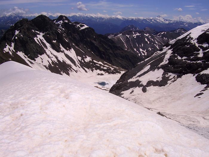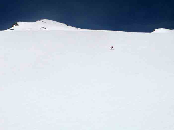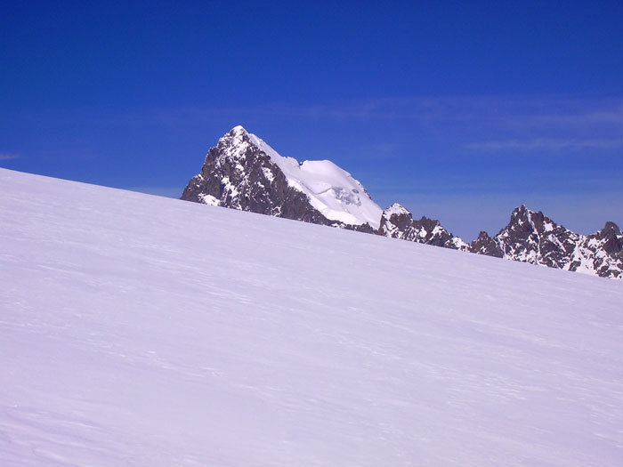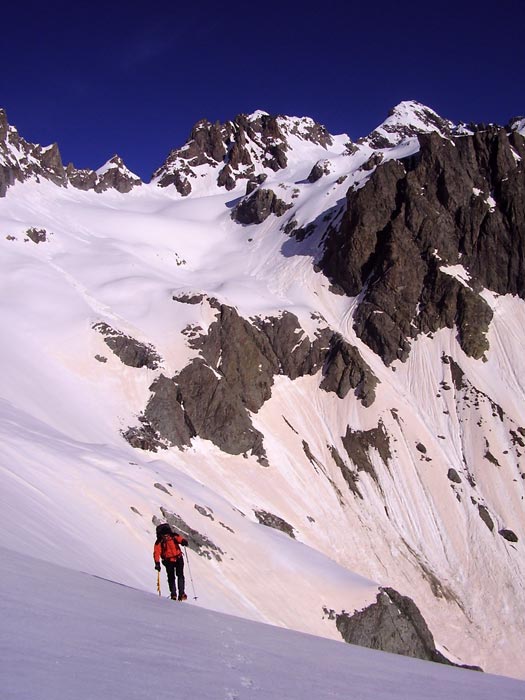 Comme le dit LV0, c'est la version des puristes ! De toute façon, à cette époque, il n'y a pas le choix. 1500 m de ski pour 750 m de portage, le ratio est largement respecté. Même si 500 m étaient en mauvaise neige, il est resté 1000 m de ski excellent (tout en haut) à acceptable (en bas). L'heure tardive de la descente du glacier de Séguret-Foran, et du versant N des Grangettes est due au fait que Bruno était équipé d'une paire de raquettes assez foireuse... Il en a bavé entre 3000 et 2750. Le versant N du col des Grangettes est enneigé au départ puis sec (il y a un spit à droite en cas de besoin). Vers 2600, on retrouve des pentes enneigées, mais rayées de nombreuses rigoles et de quelques goulottes inskiables, dont l'une m'a contraint au déchaussage vers 2500. J'ai rechaussé vers 2400 pour déchausser, moyennant un déchaussage sur 50 m à niveau, au bout d'une avalanche vers 1980 m.