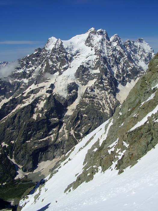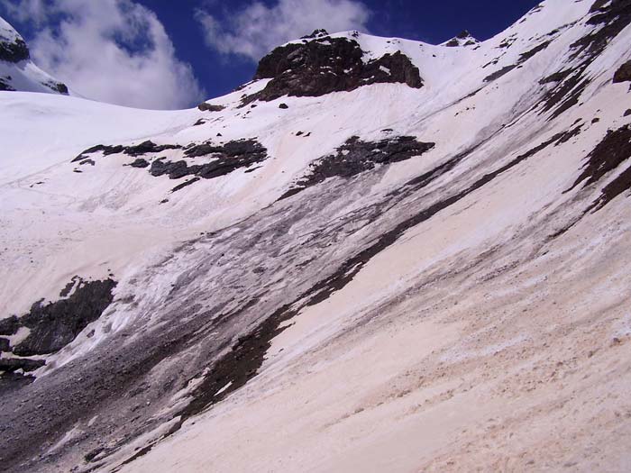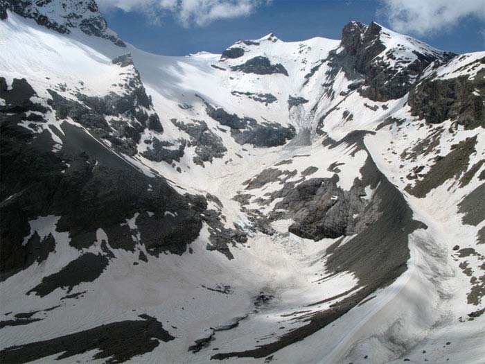 Nombreuses coulées récentes, dont certaines constituées de neige récente (blanche) ayant coulé sur le fond plus ancien (ocre). Des plaques se sont découpées à proximité des couloirs des Italiens, qui sont inskiables, et de nombreuses coulées ont ravagé la pente sous la pointe 3310 sur l'arête nord-est du dôme de Monêtier, rendant la traversée vers la moraine désagréable. Le très bon regel a quand même garanti une bonne stabilité à la montée, mais l'heure tardive de la descente nous a valu une neige molle assez instable sous le col des Grangettes.