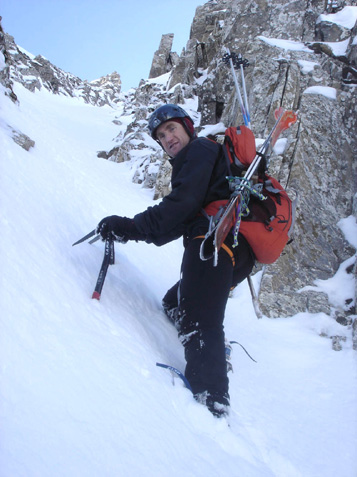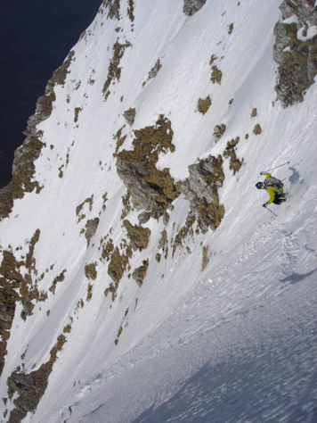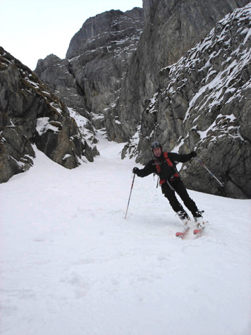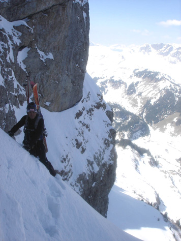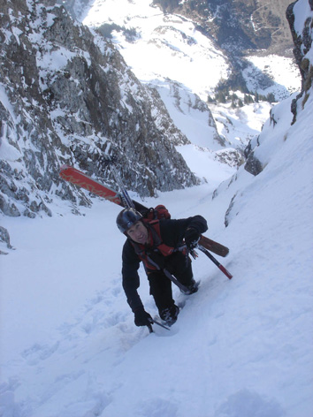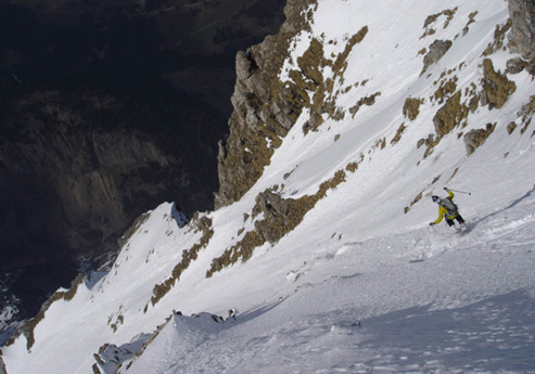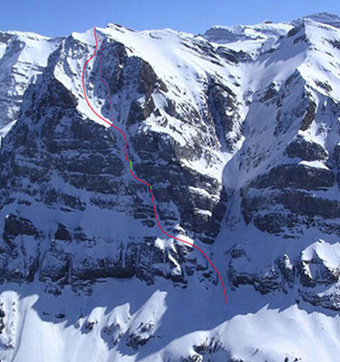 Itinéraire exceptionnel, sans doute rarement en conditions, et probablement une première. Èxposition maxi au dessus des barres, nombreux passages étroits, pentes soutenues à 45° et plus par endroits. 600 m de dénivelée. 2 rappels à la descente,effectués skis aux pieds : 30m, puis 10m (peut-etre qu'un jour, avec un enneigement exceptionnel, on pourrait voir une descente intégrale). Pour une répétition, prévoir un tamponnoir pour doubler le spit du rappel inférieur qui est moyen. A la montée, ces deux passages sont délicats à gravir (mixte sur dalles de calcaire; il faut etre à l'aise en solo. La neige exceptionnelle de ce jour nous a permis du grand ski et de belles courbes.