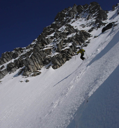 Parfaitement stable. Les contrepentes ouest étaient transformées, mais tout ce qui était nord ou nord-ouest était en poudre. Trop bon ! On a attaqué la descente à 16h, car le soleil donne très tard dans ce raide versant.