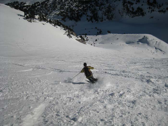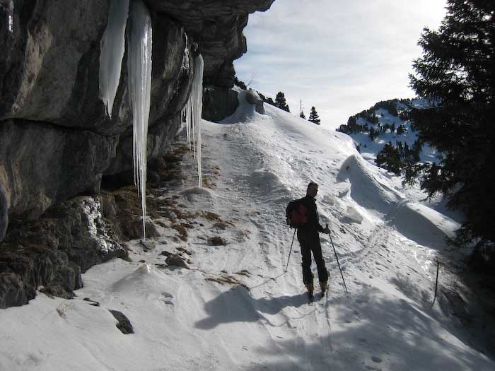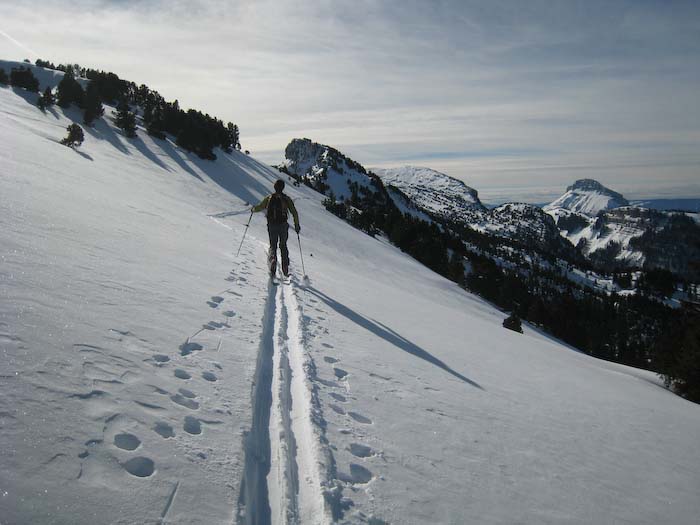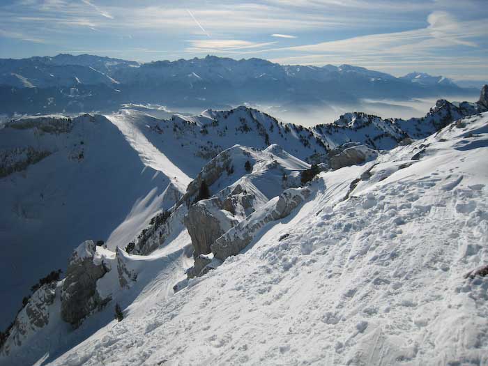 Des Lances, un Dôme et une Dent. Le jeux consiste au départ de Perquelin de parcourir les Lances puis le Dôme de Bellefont puis de traverser jusqu'à la Dent de Crolles que l'on descend par le pas de l'Oeille, retour à Perquelin. La traversée Dôme - Dent fait 4 km, ne connaissant pas le quartier nous avons fait une première tentative par le GR qui traverse le Chaos de Bellefont. Comme nous n'étions pas là pour faire du bloc mais du ski, nous avons rapidement fait demi tour pour suivre la traversée normale qui était tracée. A partir du pas de Rocheplane nous sommes descendus rejoindre le GR, passage rusé et magnifique pour passer la barre rocheuse.