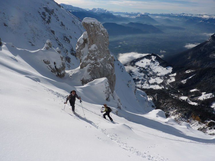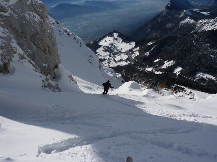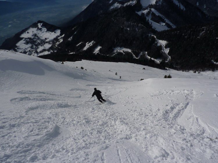 Soleil du matin, pas de trace à la Dent, même si ce n'est pas encore tout à fait assez enneigé dans le pas, quel plaisir d'être là. A la descente ça gratonne un peu mais en passant les premiers c'était plutôt plaisant. Bon c'est sûr vue l'enneigement ça ne va pas supporter beaucoup de passages...