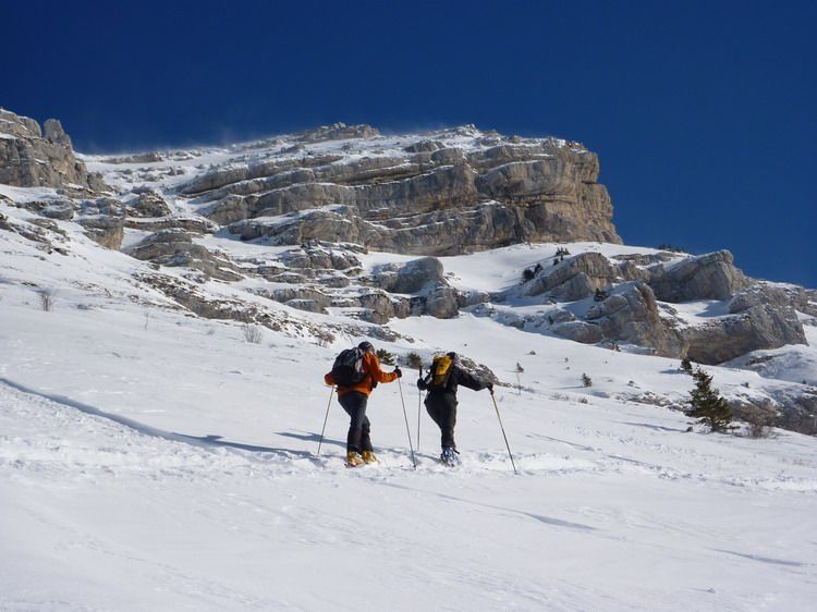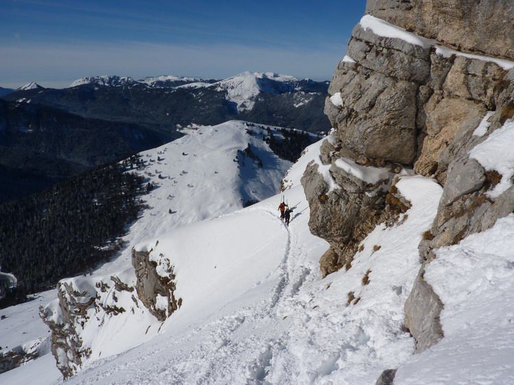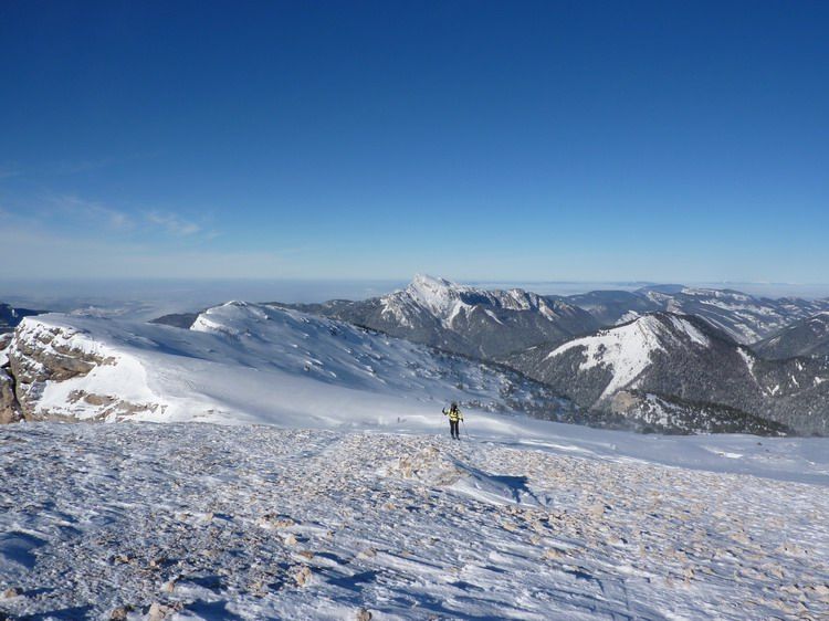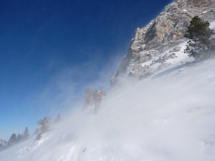 On ouvre la série des midis/deux. Le pas de l'œil est bien traffollé et un peu déneigé par les passages mais ça passe. On pensait retrouver la chaleur du soleil au-dessus du brouillard grenoblois, finalement un vent très fort nous a cueillis dès la mi-pente, du coup ambiance de réacteur mais sympa quand même.