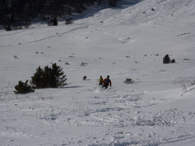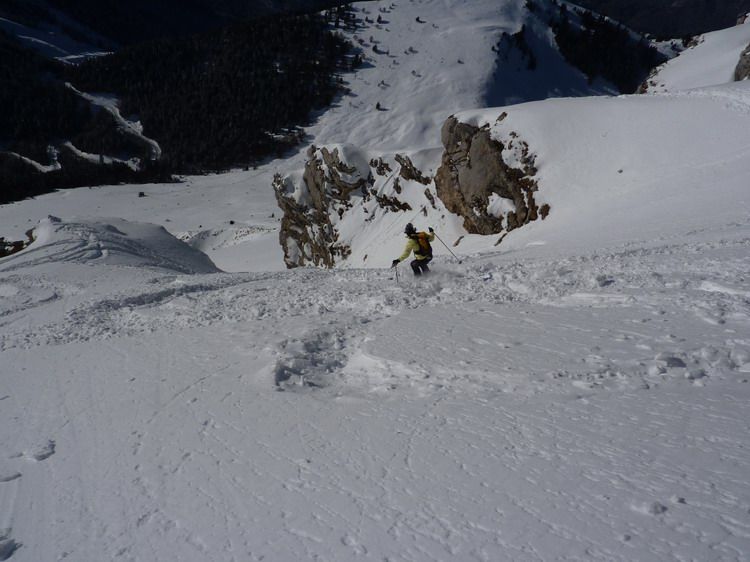 Début de transformation dans le pas de l'œil. Fort transport par le vent à partir de la mi-champ. En bas la poudre se densifie doucement. Pas mal de cailloux de ci de là, facilement évitable en skiant avec un peu de retenu.