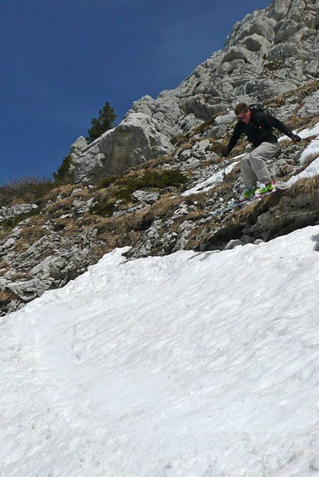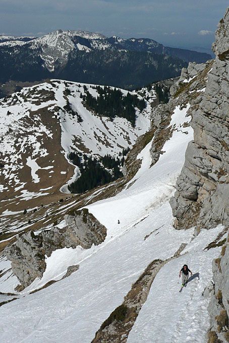 Névé de haut en bas. très bon ski. Par contre (voir commentaire), c'est limite en enneigement. Ca passait encore très bien (pour combien de temps) moyennant un seul déchaussage pour entrer dans le pas de l'Oeille et en acceptant 2-3 très courtes jonctions sur herbe et un passage gratte-gratte (Un autre déchaussage pour moi dans la traversée mais uniquement par respect pour les skis en carbone à 1000 euro).
