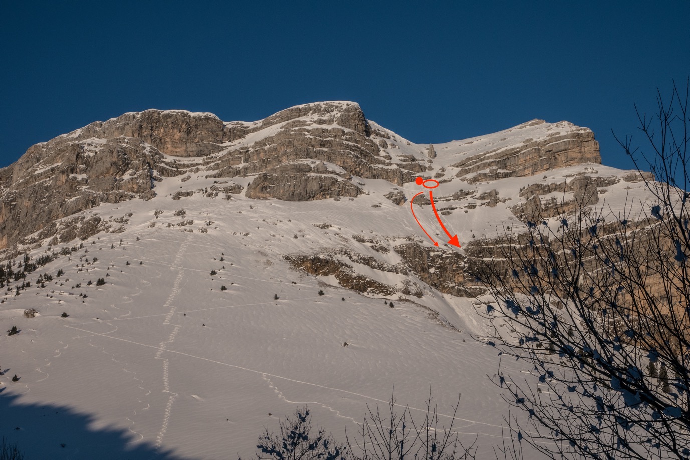 Ski de neige lourde en toutes orientations sous 1600 ; un peu mieux en nord au-dessus. Après avoir remonté le premier couloir en neige majoritairement dure, je m'aperçois que la pente à droite est bien chargée (la neige du couloir y a sans doute été transportée) et peut partir. Hors de question d'aller donc sur la droite. Je m'arrête sur la vire du câble et enlève les peaux. Au moment de partir, j'appuie un ski sur la vire et comme pressenti, une petite plaque se détache à deux mètres sur ma gauche (en regardant l'aval) par vibration. Cette plaque de type "chaude" glisse lentement, ralentit au niveau du léger replat mais finit quand même par sauter la petite barre ce qui lui donne suffisamment d'inertie pour plonger jusqu'à la Gorgette.