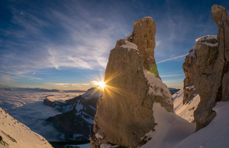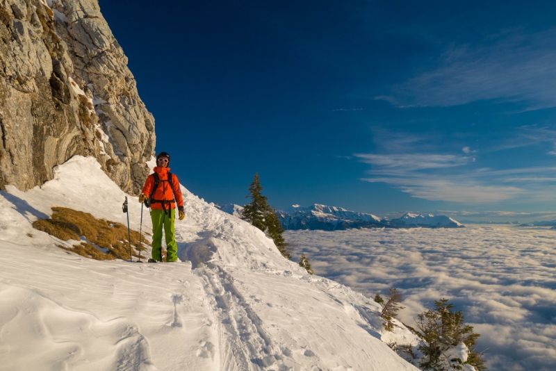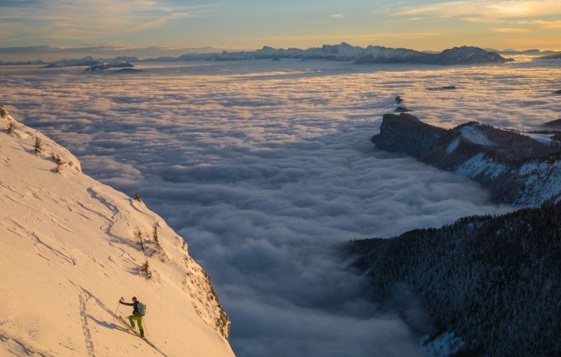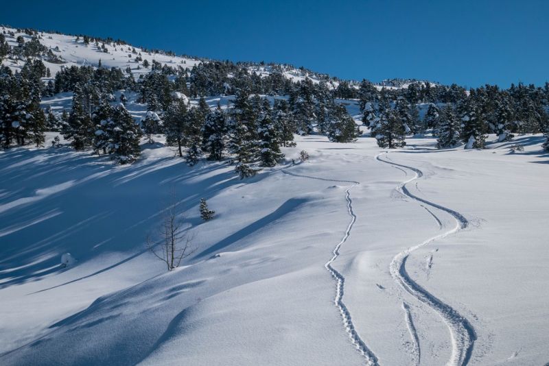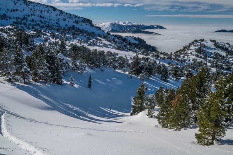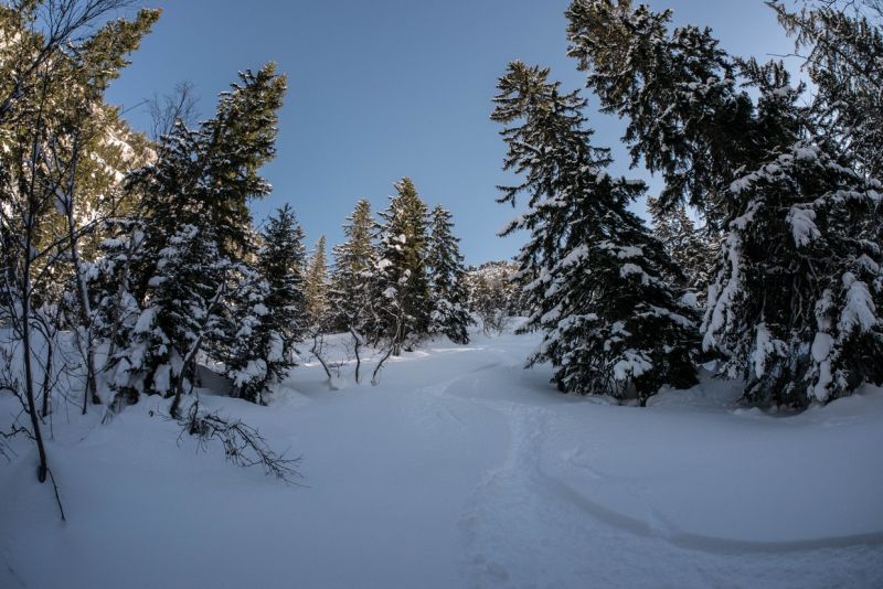Neige restée poudreuse du NE à l'W. Les autres orient' ont chauffé. La neige colle en forêt même en nord, sans doute à cause du brouillard et de l'effet "loupe". Se méfier de l'accumulation sous la crête de la Dent au-dessus de l'Oeille (due au vent de nord-est) et bien sortir au pas. A14 sera croûtée demain.